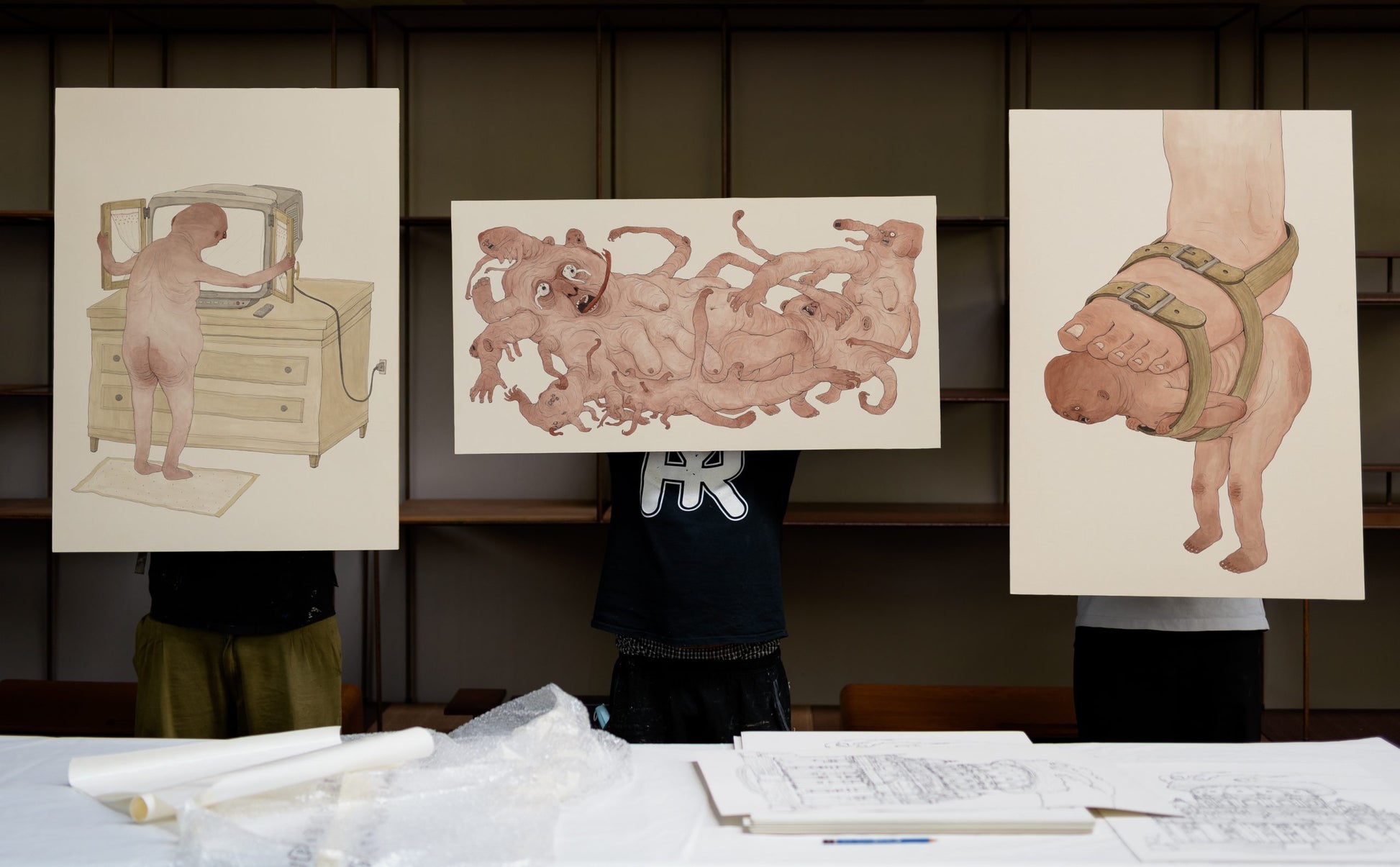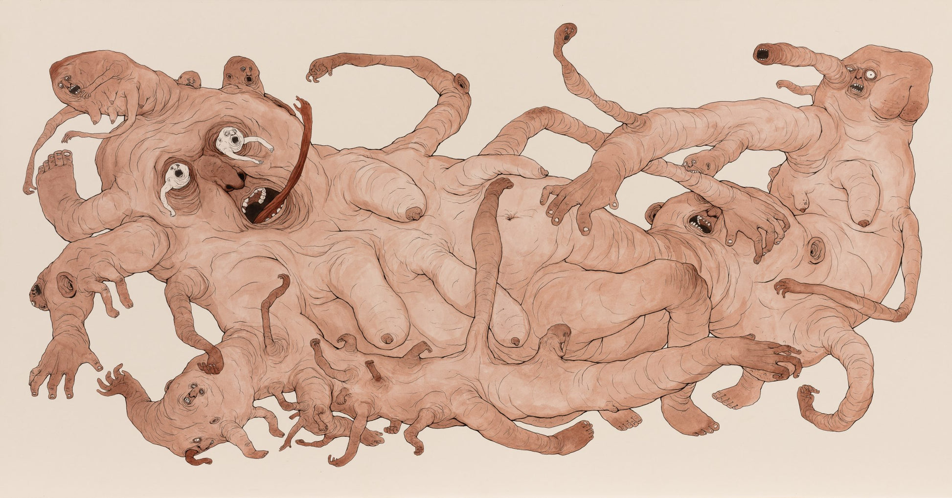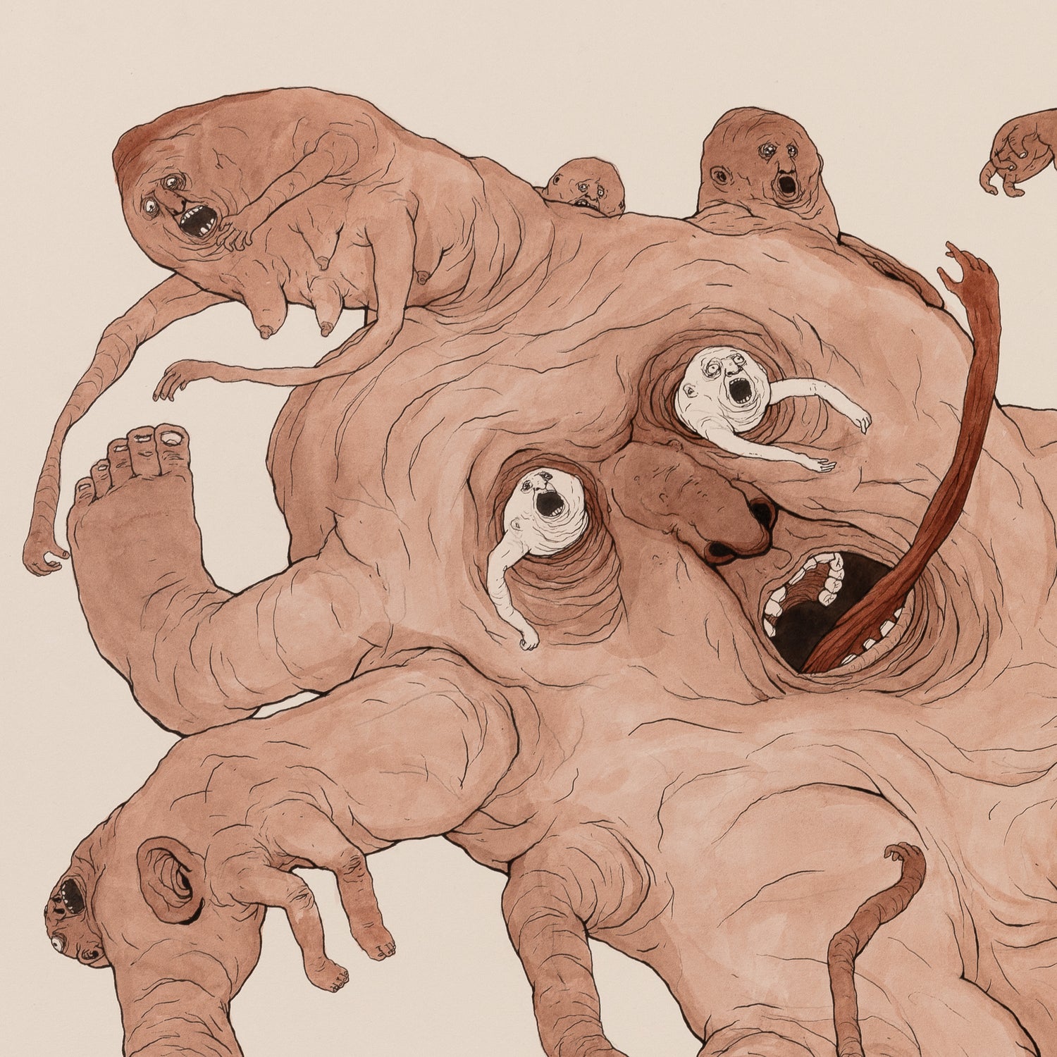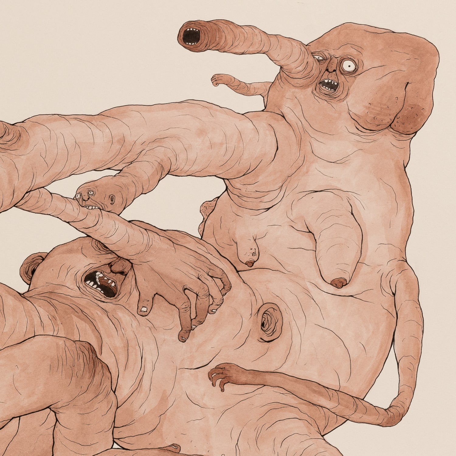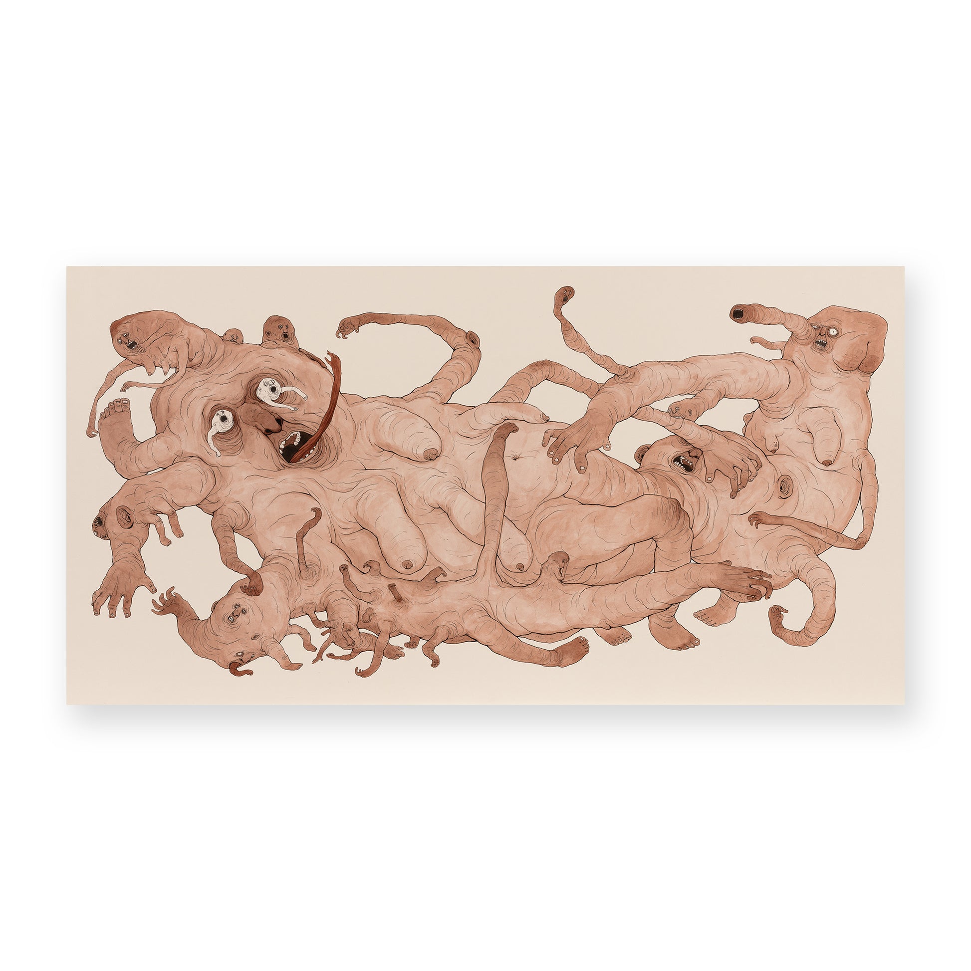 In this series of artworks, realized between 2018 and 2019, Nemo’s, continues and deepens his research on the human being as a “social animal”: through his typical hominids “naked and devoid of any sign of civilization”, the artist describes and analyzes situations and realities that are different from each other but at the same time lead to the universal condition of loss of humanity in today’s society.Starting from our relationship with television, with the screen, which filters all kinds of information and often becomes the only channel of contact with a reality that paradoxically becomes increasingly distant and almost inaccessible.Then we find the “untouchables”, the last step on the hierarchical ladder of the Indian caste system: people so poor that they cannot even be touched, but who carry on their shoulders the weight of an entire economic system.Finally, the representation of the chaos that permeates all that surrounds us is entrusted to the image of a being whose anatomical parts are formed by as many human figures that intertwine with each other.