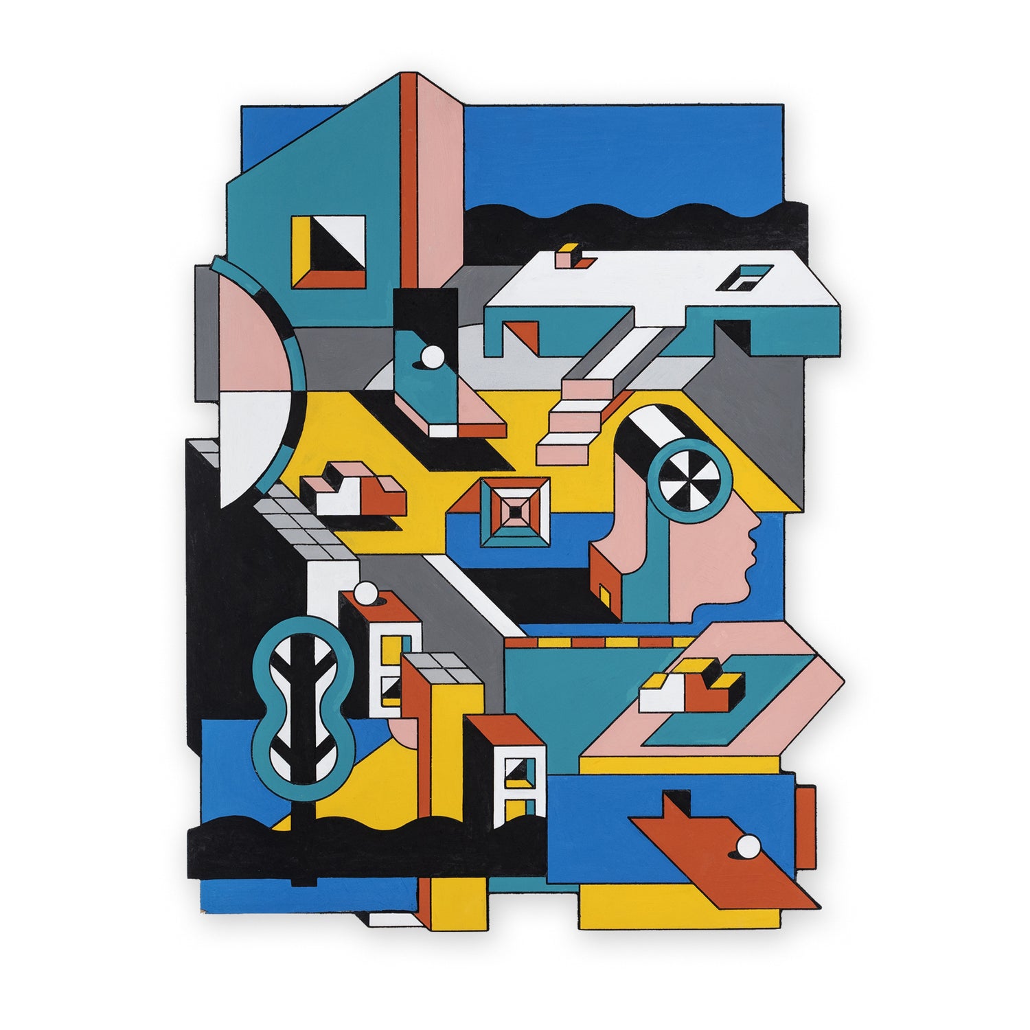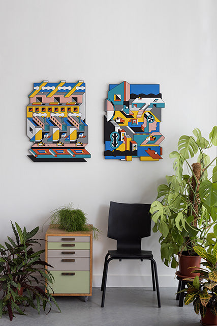 The spatial worlds of Johan Moorman are reminiscent of classic arcade games, the works of Dutch graphic artist Escher, and old Lego (Danish toys) catalogues. Moorman’s graphics and murals are undeniably Anti-Design, yet elegant in color, lines, and design language. Johan Moorman (1979) finds inspiration in retro-futuristic images, architecture, music, and technological innovation: Moorman was the one to design the poster for the legendary 2013 Kraftwerk 3D concert series in former technology museum Evoluon in Eindhoven, The Netherlands. Johan Moorman started his career as a graffiti artist from the Dutch ‘city of light’. He likes to explore and didn’t stop experimenting, neither in style nor multimedia use. He grew up in a city built on technology and design, and later graduated from the renowned Willem de Kooning Academy in Rotterdam, The Netherlands. The artist is influenced by De Stijl (neoplasticism), Pop art, and the Memphis Group / Postmodernism. Time seems to have frozen in some of his works. They feel like playgrounds that perfectly balance objects and shapes - an adventurous world that needs to be explored.