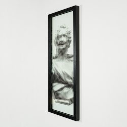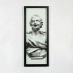 The classical busts have been screen printed on two distinct and superimposed supports: paper and glass.