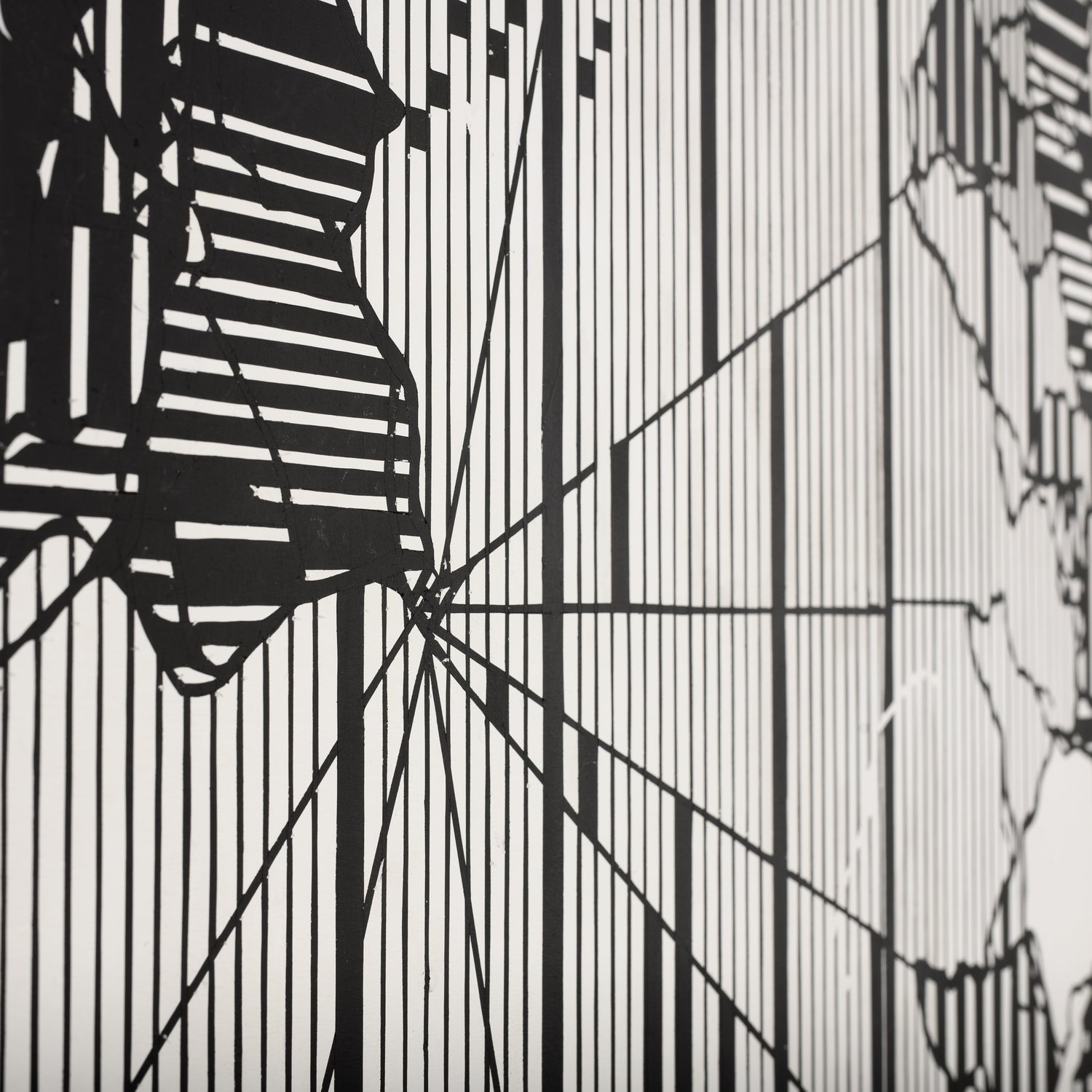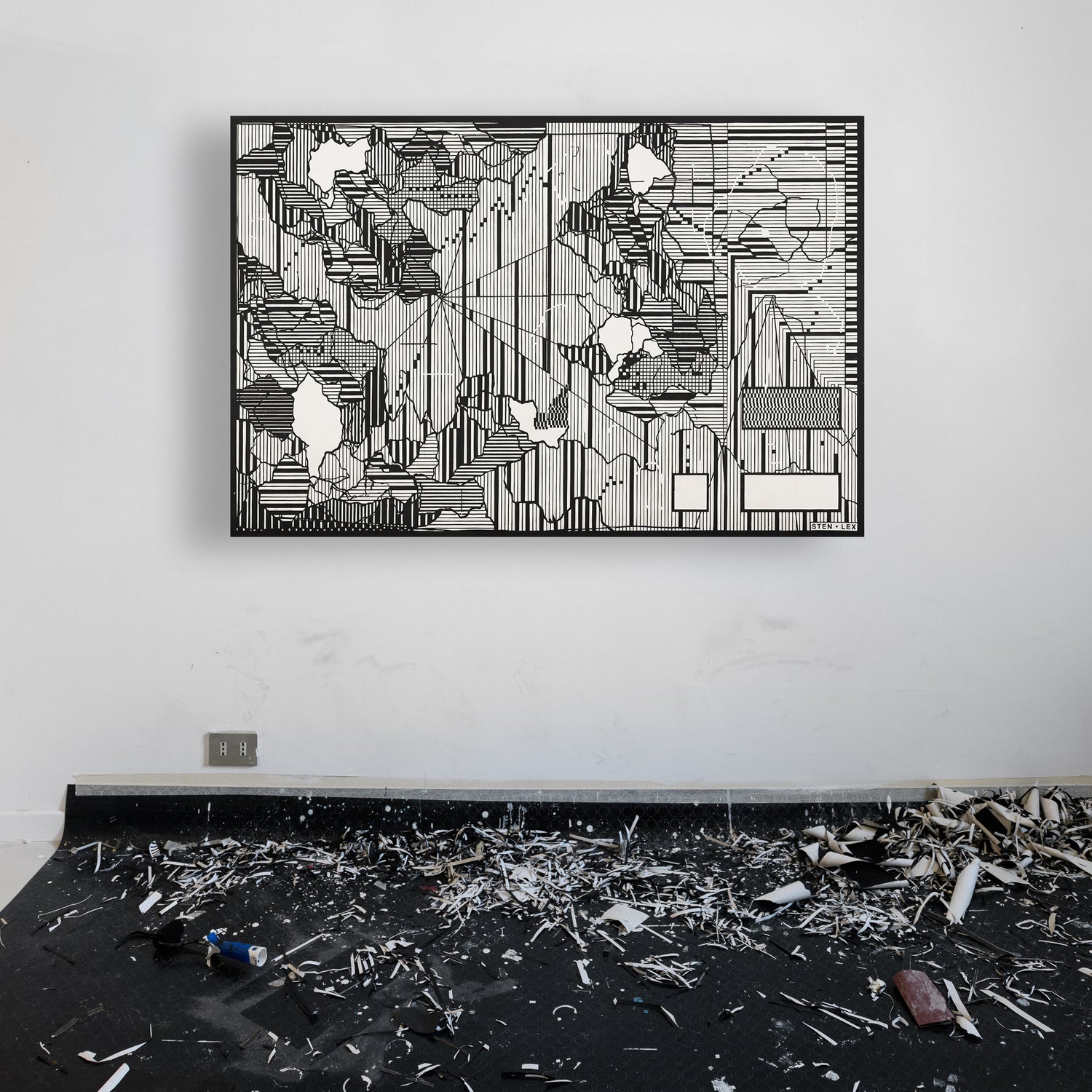 This process consists of putting up a poster on the street made up of lines or dots. It is then cut out by hand on the wall to which it is applied, the paper matrix is then painted black and finally destroyed to reveal the final result. The concept behind this process is that atmospheric agents, rain, and wind destroy the matrix over time revealing the actual work.