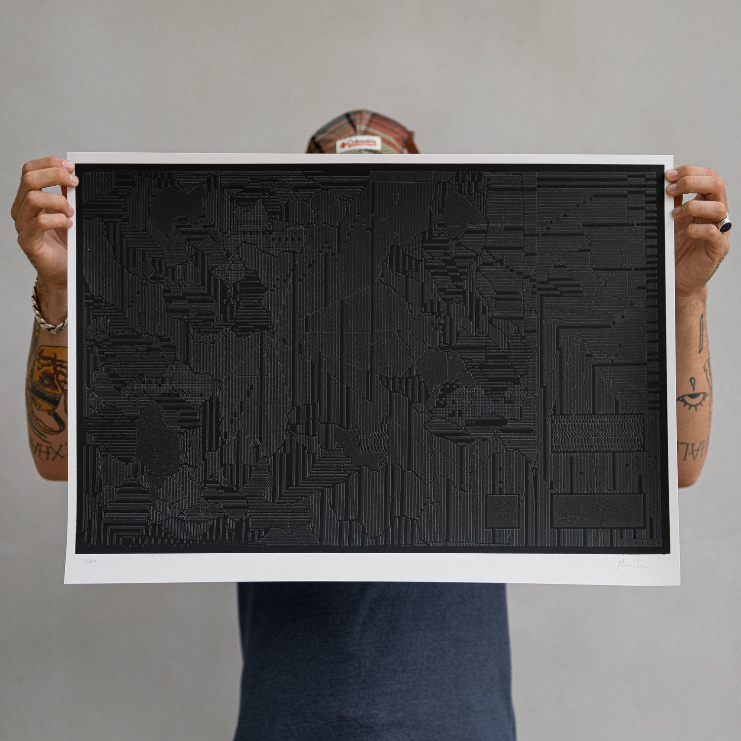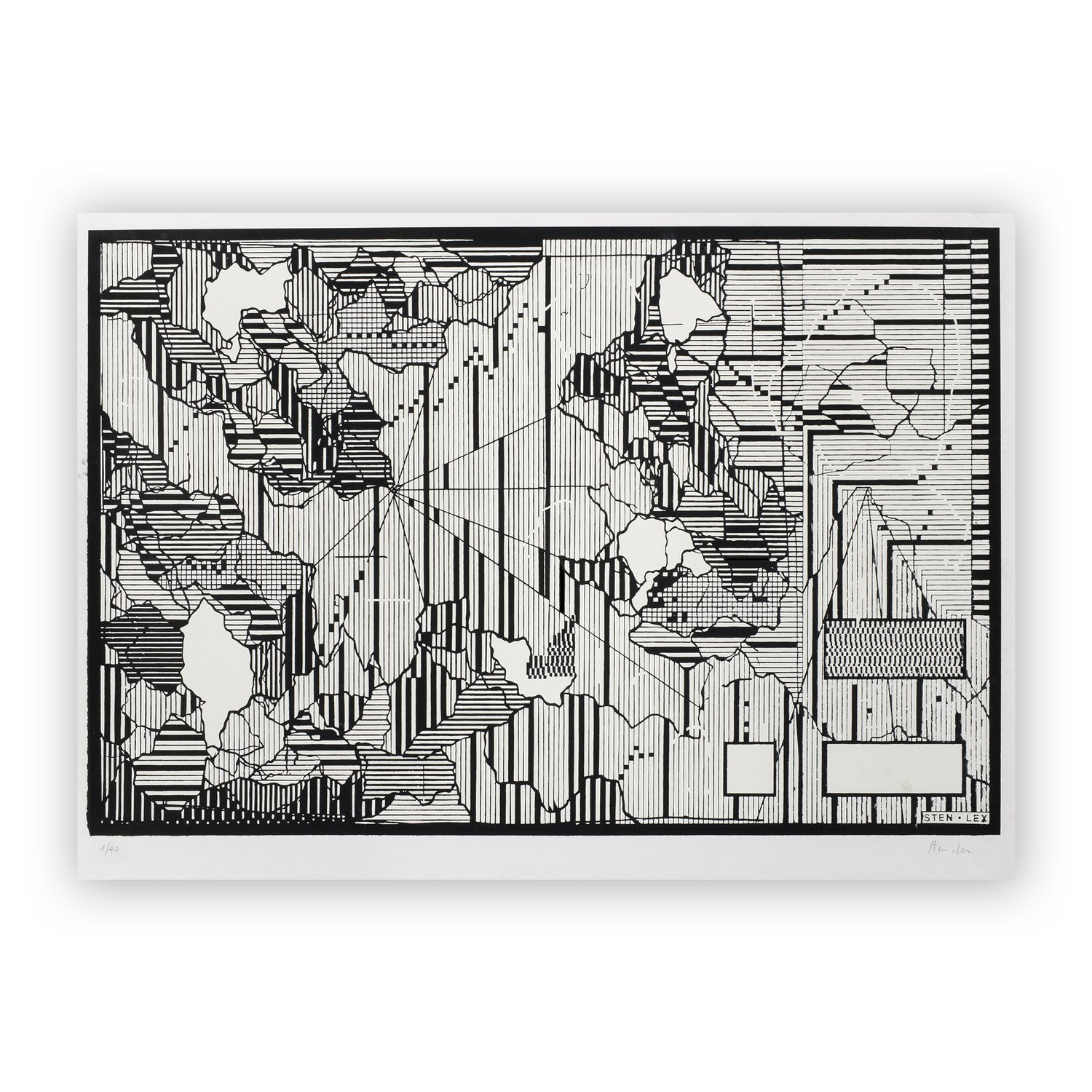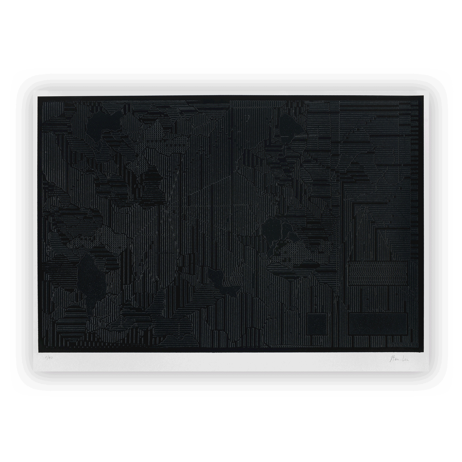 The result is a print, produced by Varsi Lab in a limited edition of 40, which reproduces in the first instance the whole, consisting of the matrix and the final work. The latter is hidden, concealed from view by the black of the matrix that fills the space. Sten Lex thus lets us take control of the process of revealing the work, leaving it up to us to decide whether to make it an active or passive process, to destroy the matrix or to let time reveal to us what lies beneath.”