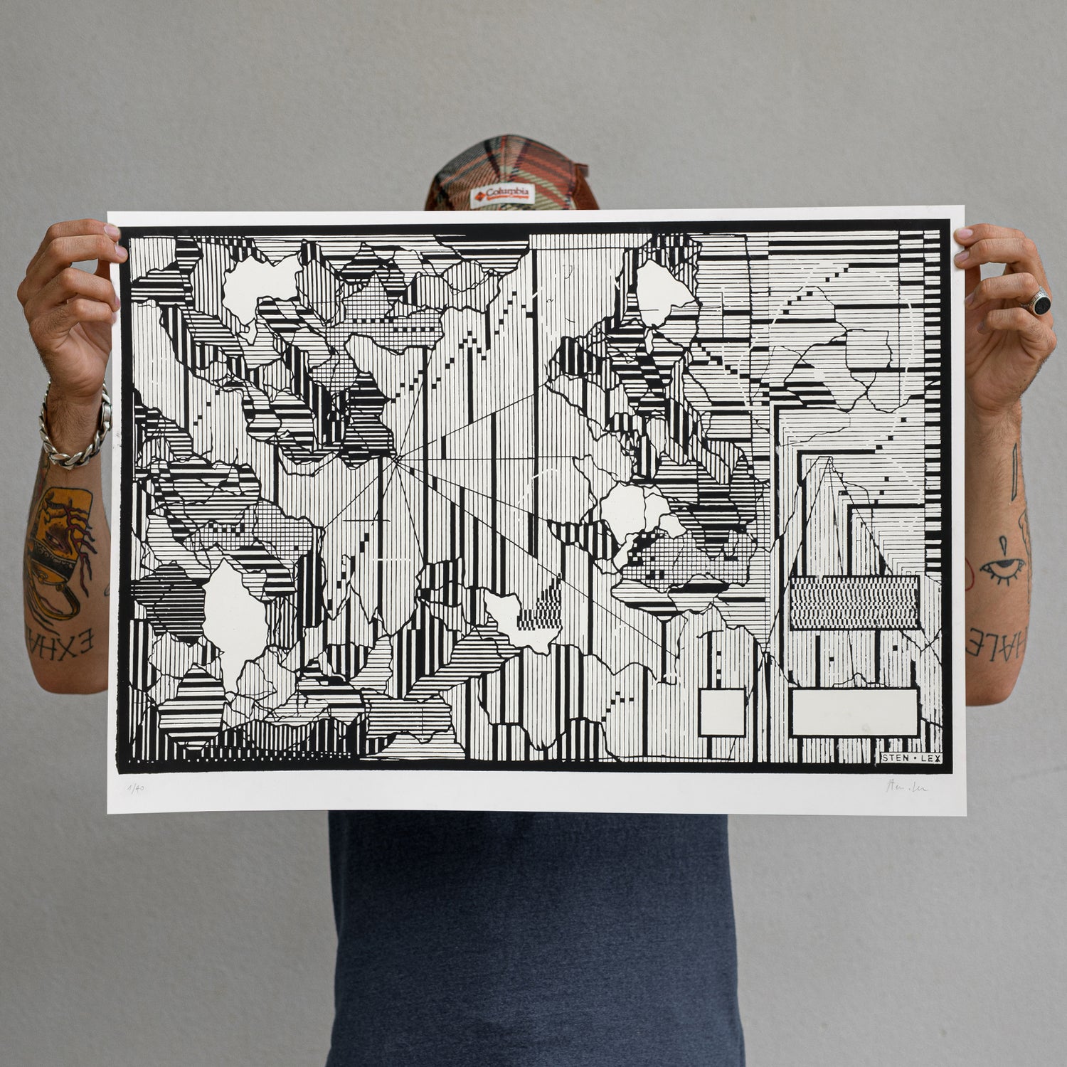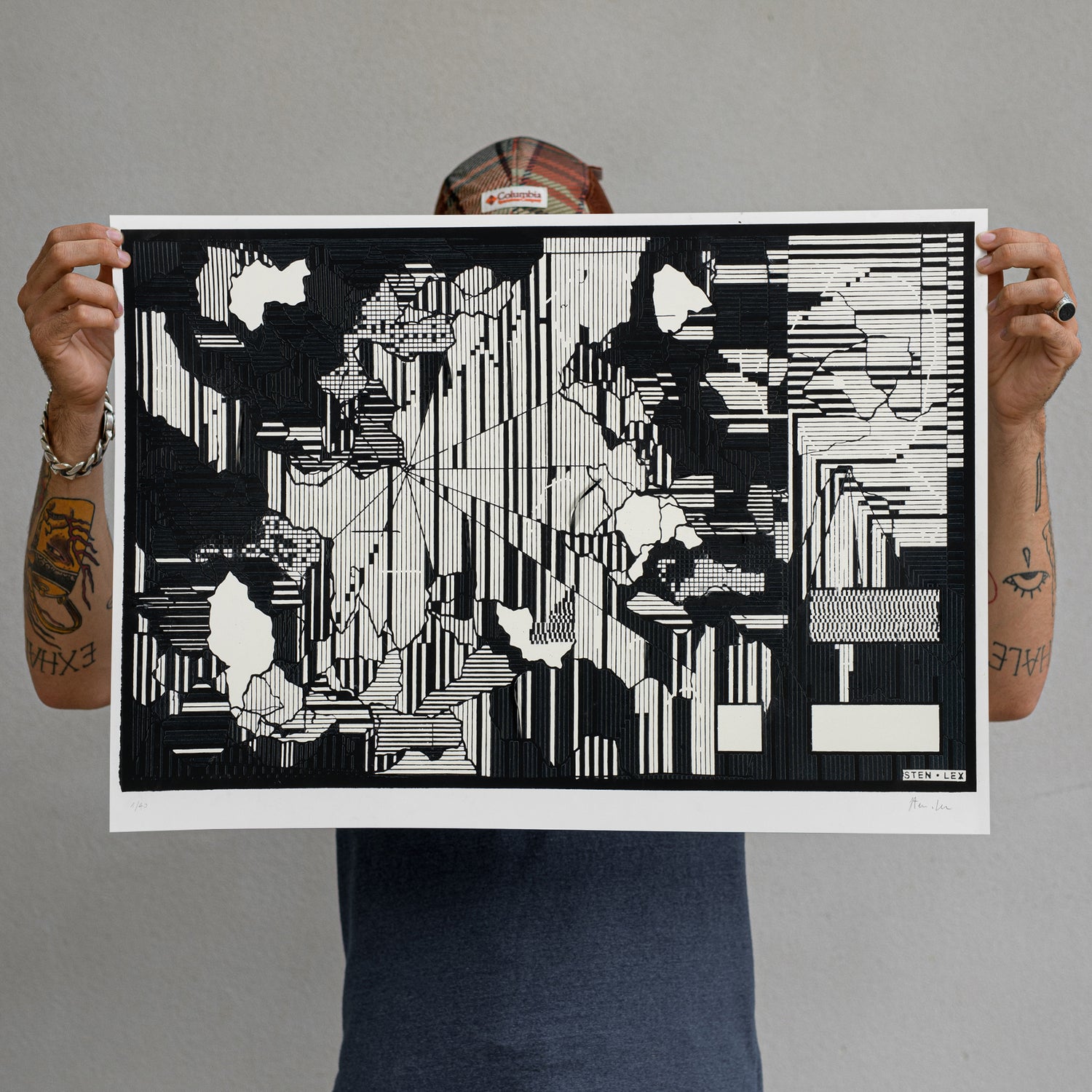 Sten (Rome, 1982) and Lex (Taranto, 1982) realized the first stencil in the streets of Rome in 2001 and are considered among the main diffusers of "Stencil Graffiti" in Italy. The duo is known internationally for having introduced, since 2002, the use of halftone in the stencil process. The graphic elaboration, which they call Hole School, consists in cutting out an image composed of dots or lines: a portrait appears so realistic from a distance, abstract from close up. The subjects of their works are anonymous characters, photographed by themselves or rediscovered in old photographic archives, painted in a black and white stencil, and the result of research on Western photographic portraits from the '60s until today. In 2008, Banksy invited Sten Lex to participate in the Cans Festival in London together with a group of artists specialized in "Stencil Graffiti". Starting from 2010, Sten Lex create stencils cut out on paper and glued on the walls. After years of using both stencil and poster media, the duo created a process they call Stencil Poster. The process consists of posting on the street, a poster made up of lines or dots. The poster is hand cut out on the wall on which it is applied, the paper matrix once cut out, is painted black and finally destroyed to give space to the final work. The concept behind this process is that atmospheric agents, rain, and wind slowly destroy the matrix over time, revealing the final artwork as the matrix dissolves.The essential meaning of the "stencil", which is considered a technique for reproducing the same image over and over again, is thus brought to the point of paradox in that by destroying the matrix, which is also part of the work, its reproducibility is diminished. Sten Lex’s art is spread all around the world. The work of the duo can be admired on the walls of Austin (TX), Gibellina (IT), Bangkok (THA), Monterrey (MX), and many other cities worldwide. During these almost 20 years of activity, Sten Lex exhibited at the Danysz Gallery of Shanghai, the Museum of Contemporary Art in Rome (IT), the Caradente Museum in Spoleto (IT), the Centre de la Gravure et de l’Impage imprimée (BE), the Street Art Museum in Saint Petersburg (RU) and La Condition Publique in Roubaix (FR).