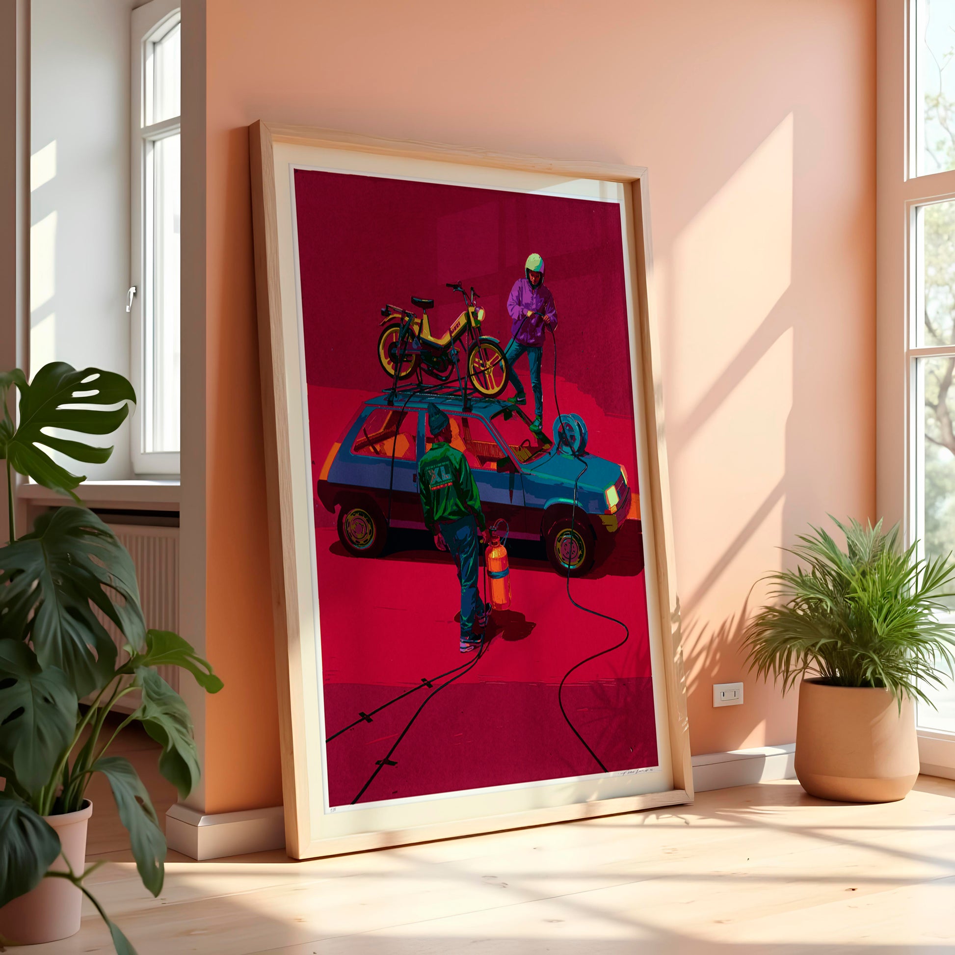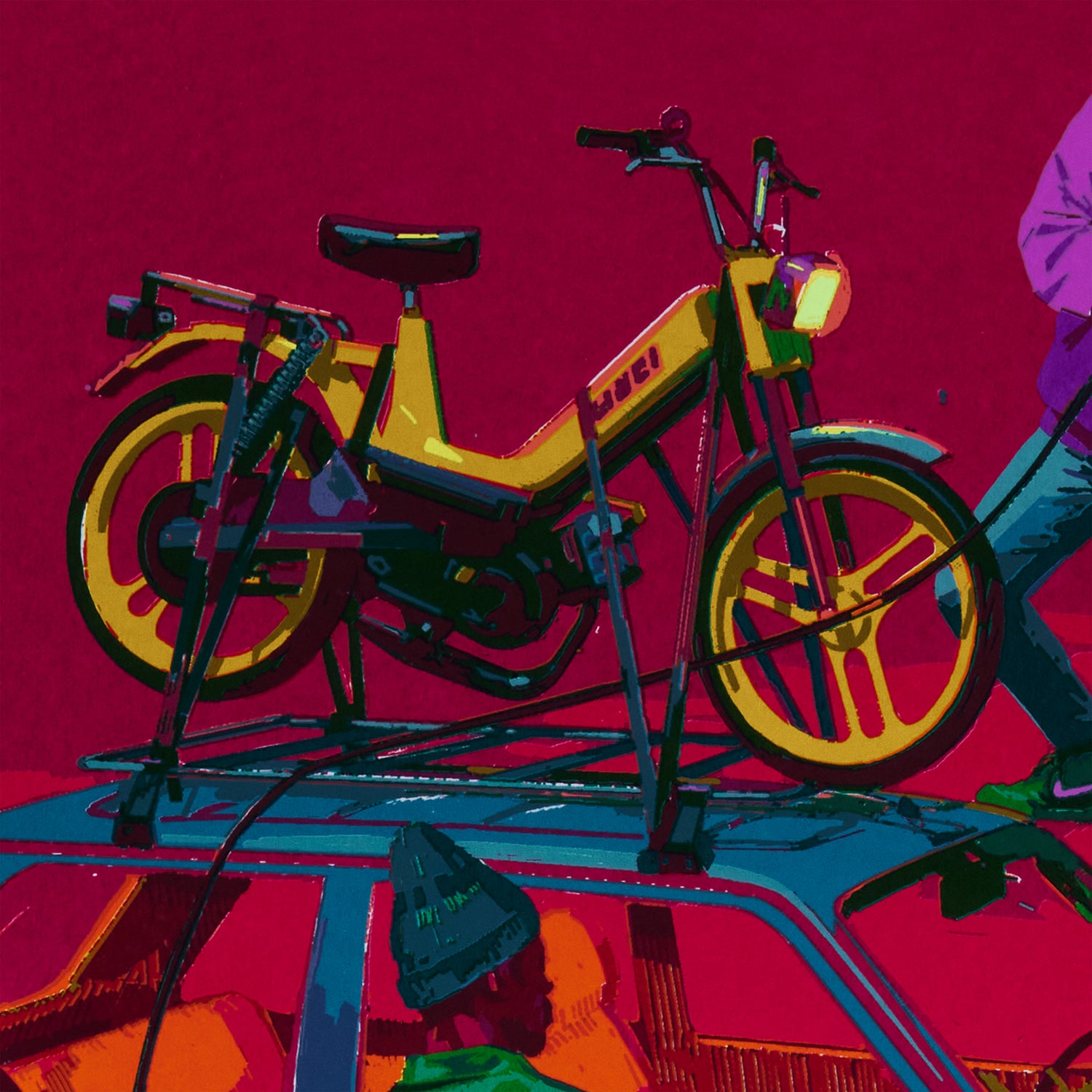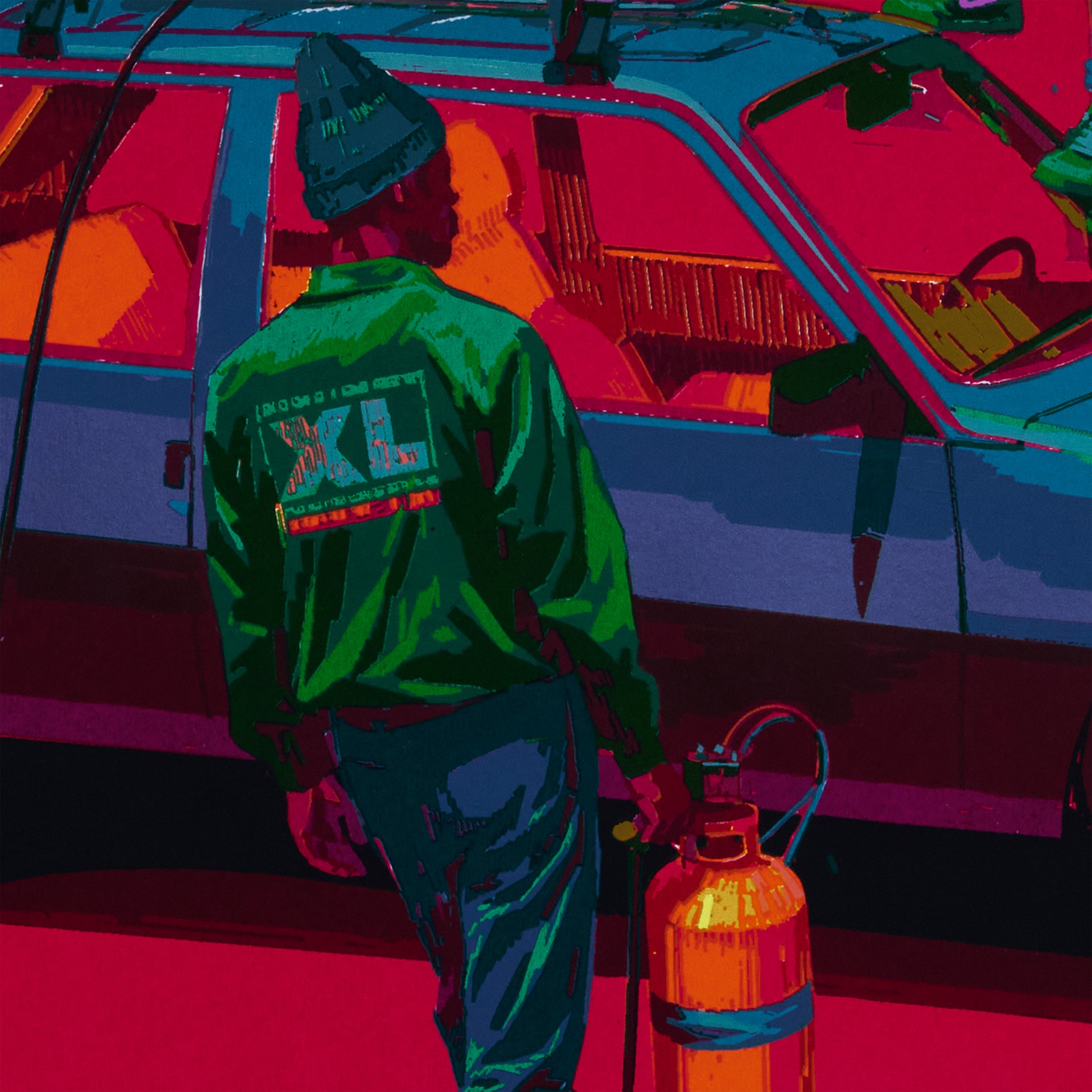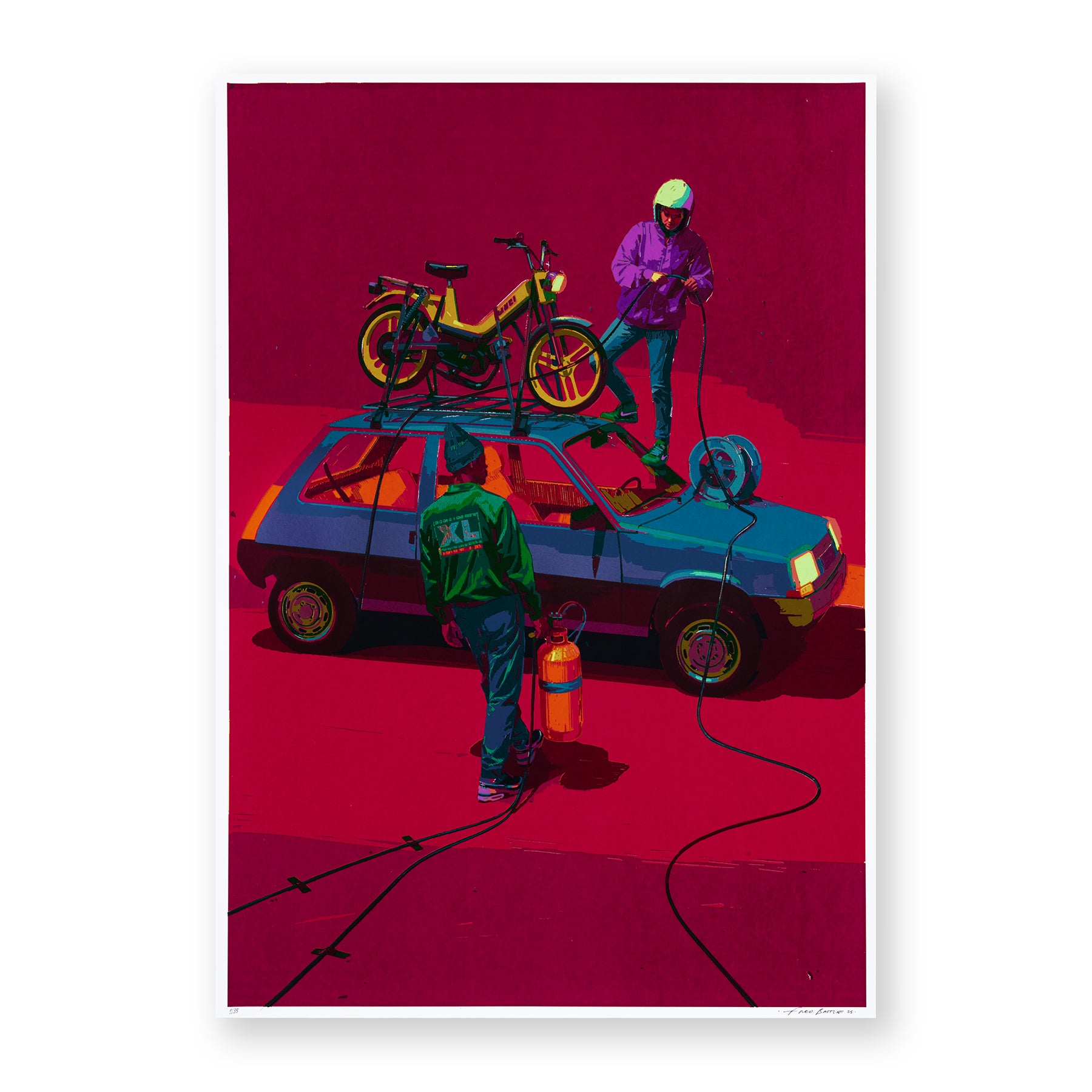 The action linking the two characters remains mysterious. They appear to be connecting an electrical system, could it be a sound system? If it’s connected to gas canisters, what are they cooking up? Or perhaps they’re preparing to escape on a moped?