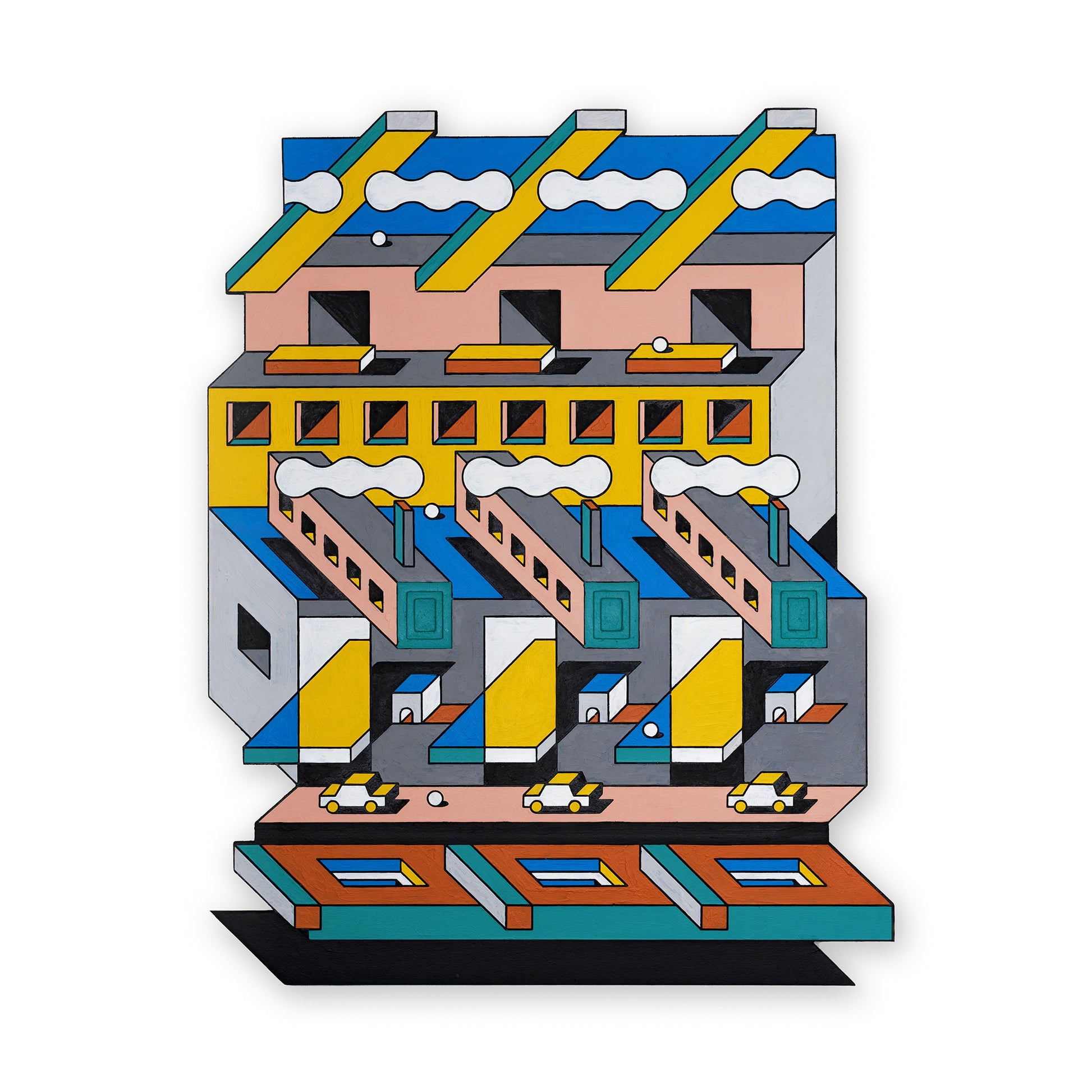 The spatial worlds of Johan Moorman are reminiscent of classic arcade games, the works of Dutch graphic artist Escher, and old Lego (Danish toys) catalogues. Moorman’s graphics and murals are undeniably Anti-Design, yet elegant in color, lines, and design language. Johan Moorman (1979) finds inspiration in retro-futuristic images, architecture, music, and technological innovation: Moorman was the one to design the poster for the legendary 2013 Kraftwerk 3D concert series in former technology museum Evoluon in Eindhoven, The Netherlands. Johan Moorman started his career as a graffiti artist from the Dutch ‘city of light’. He likes to explore and didn’t stop experimenting, neither in style nor multimedia use. He grew up in a city built on technology and design, and later graduated from the renowned Willem de Kooning Academy in Rotterdam, The Netherlands. The artist is influenced by De Stijl (neoplasticism), Pop art, and the Memphis Group / Postmodernism. Time seems to have frozen in some of his works. They feel like playgrounds that perfectly balance objects and shapes - an adventurous world that needs to be explored.
