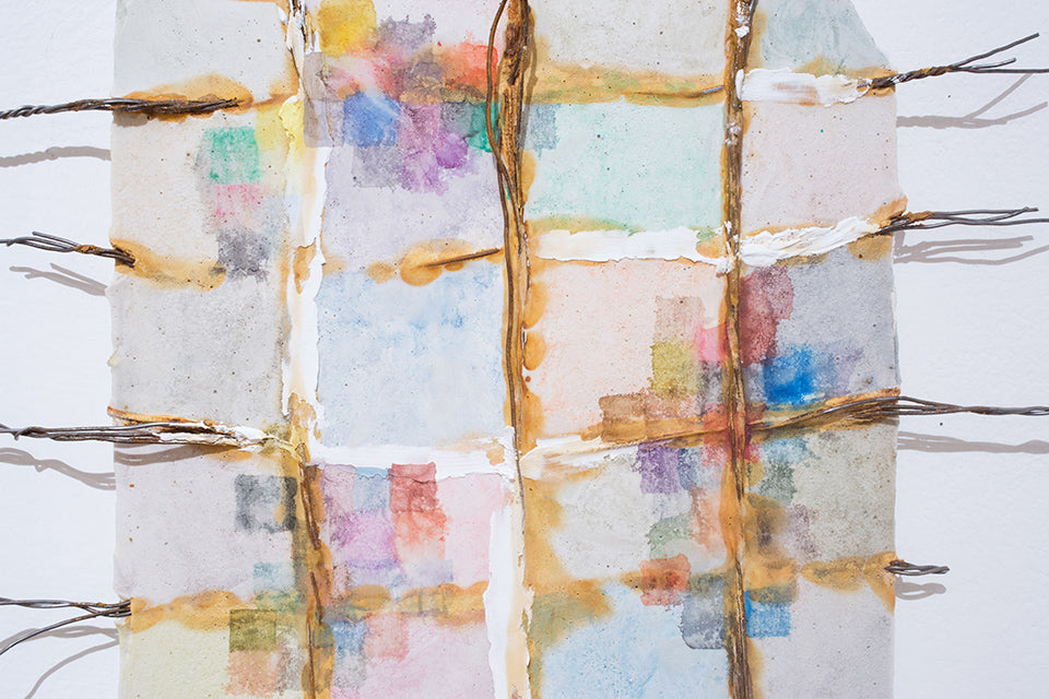 Since 2017 the interest of the artist moves towards the matter and the creation of devices made of poor materials which are linked to the building and agriculture’s world such as concrete, iron, wood, agricultural nets, but also fabrics, plaster and glass, telling us about a super-natural reality.