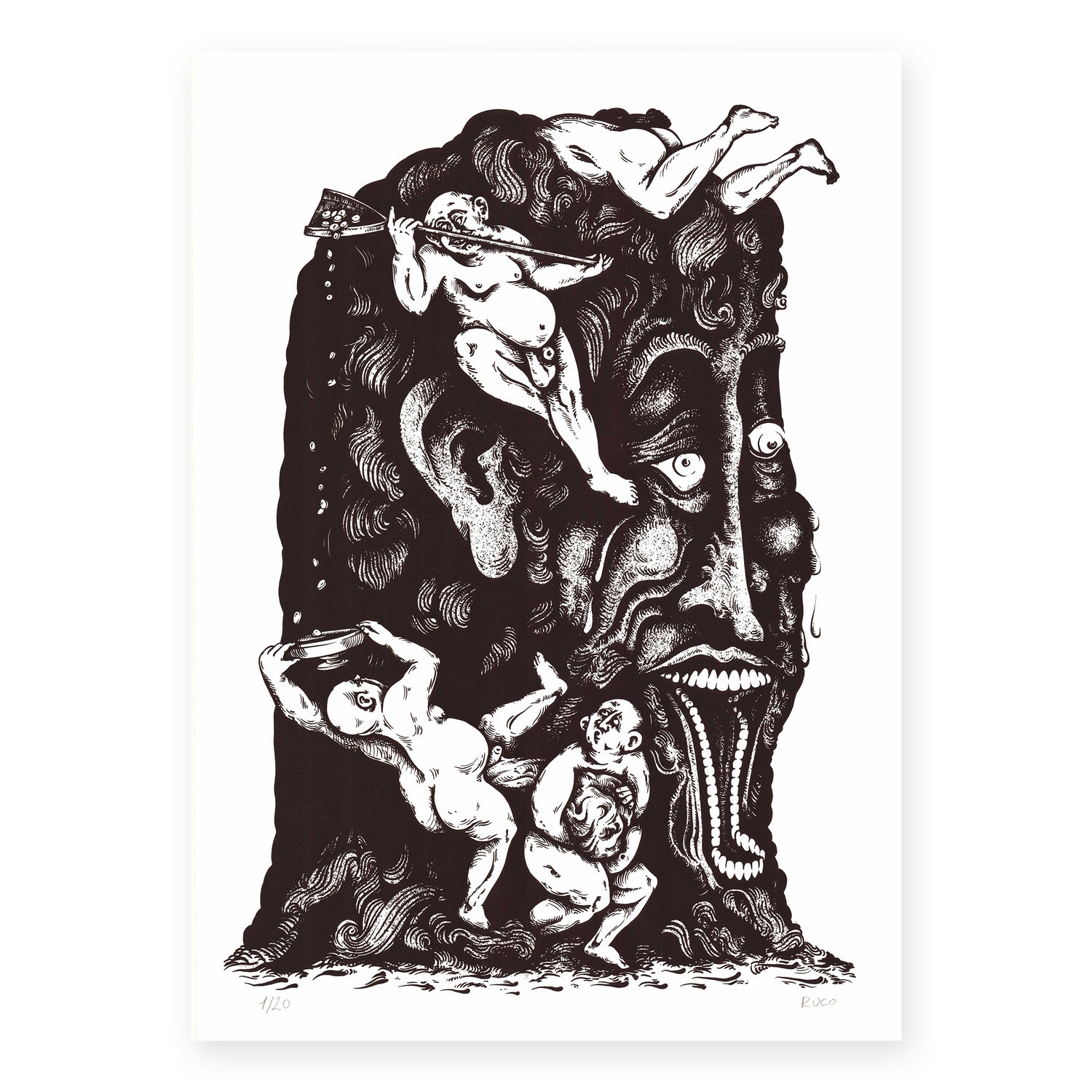 Ruco was born in Rome in 1991 and he has been drawing since he can remember. During high school, he began to take an interest in the world of tattooing and approached thisjob as soon as he finished school. Ruco began tattooing in 2012 in Florence, while studying Art Printing Techniques at the Academy of Fine Arts and he began receiving invitations as a guest in several studios around the world: Mexico, Israel, Honk Hong... His figurative style is the result of numerous influences from the most different fields. The main thread is related to the taste for the grotesque. Passionate about masks, he made them a source of research, producing them by hand. In addition to his own tattoo studio in the heart of Rome, Ruco pursues his other passions in a small private studio where he finds his space to create masks and costumes, model clay, paint, and so on. In 2018 Ruco brought out the research project related to the theme of the tattoo ritual "STILLIFE BRÜCKE" in collaboration with Servadio: 4-handed sessions in which the surrounding environment becomes the subject of the tattoo, whether it is a predefined and static composition or a changing and dynamic situation. In this way, the subject is not previously decided nor born from the imagination of the artists but represents what you have in front of your eyes during the ritual. Ph. Credits: Shyla Nicodemi