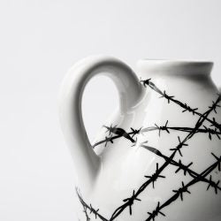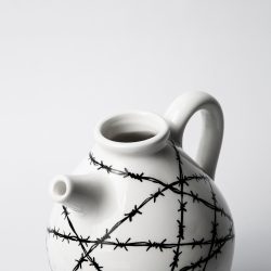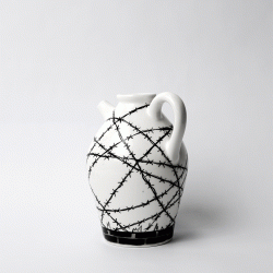 This collection of jugs is part of a larger series of artworks called “Paintings from the boat”: an ongoing body of work consisting of small paintings on found frames and objects such as vases and weird artifacts and furniture.
