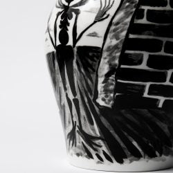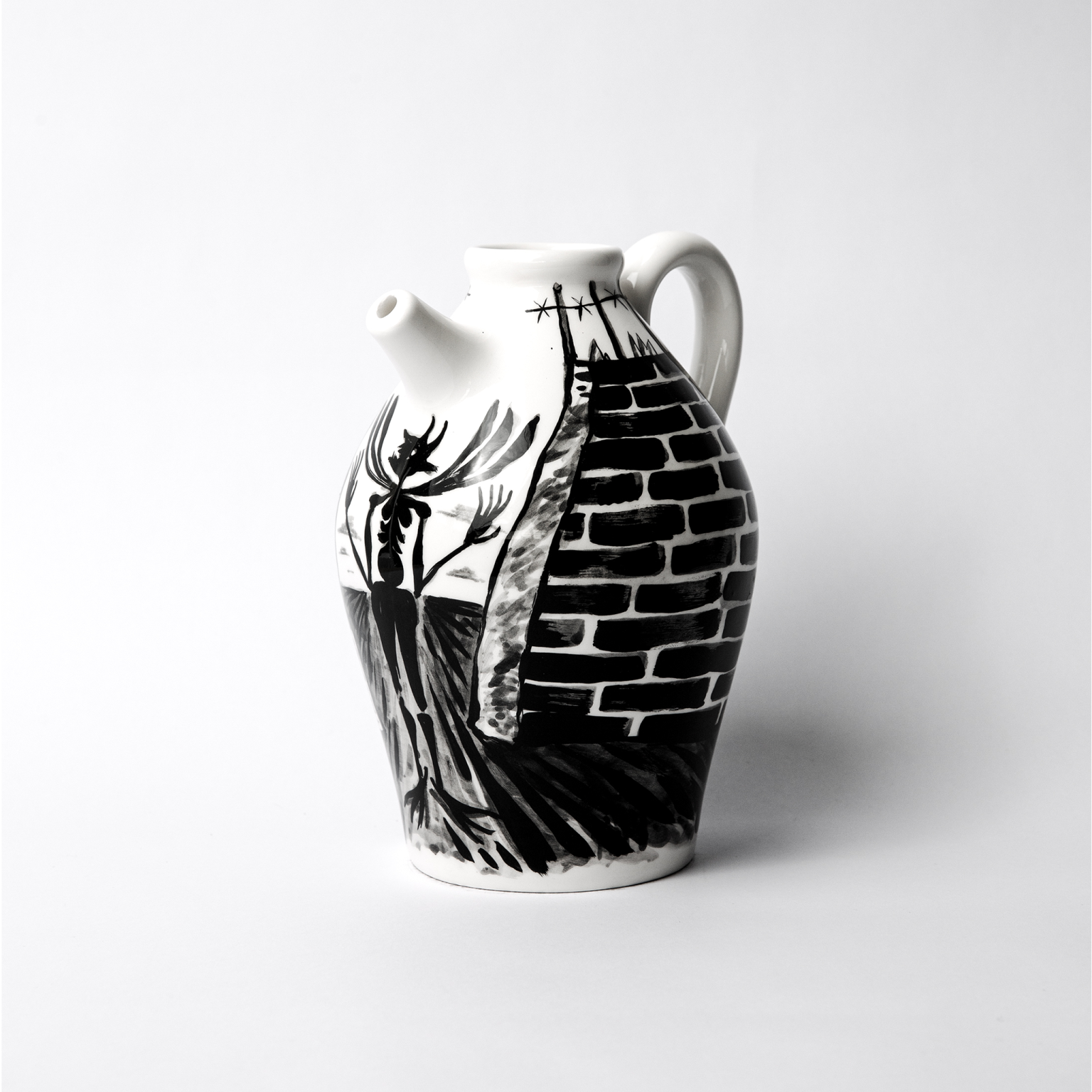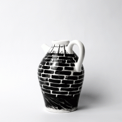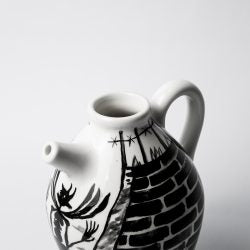This collection of jugs is part of a larger series of artworks called “Paintings from the boat”: an ongoing body of work consisting of small paintings on found frames and objects such as vases and weird artifacts and furniture.