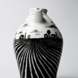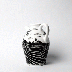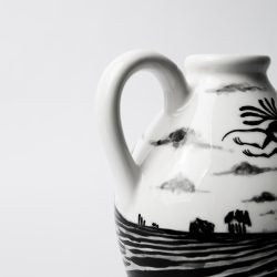 This collection of jugs is part of a larger series of artworks called “Paintings from the boat”: an ongoing body of work consisting of small paintings on found frames and objects such as vases and weird artifacts and furniture.