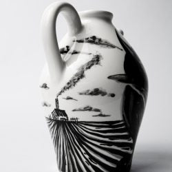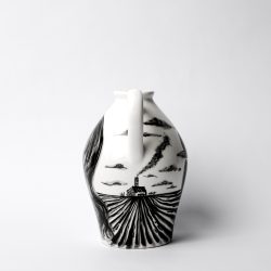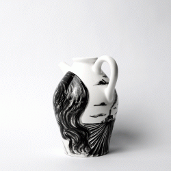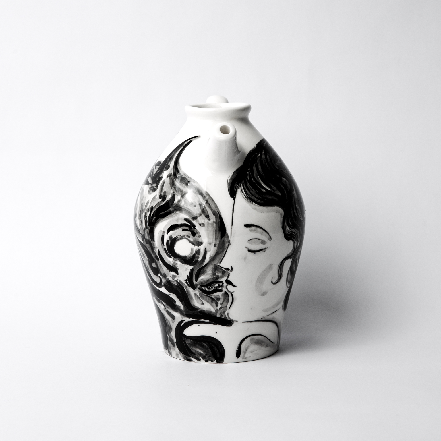This collection of jugs is part of a larger series of artworks called “Paintings from the boat”: an ongoing body of work consisting of small paintings on found frames and objects such as vases and weird artifacts and furniture.