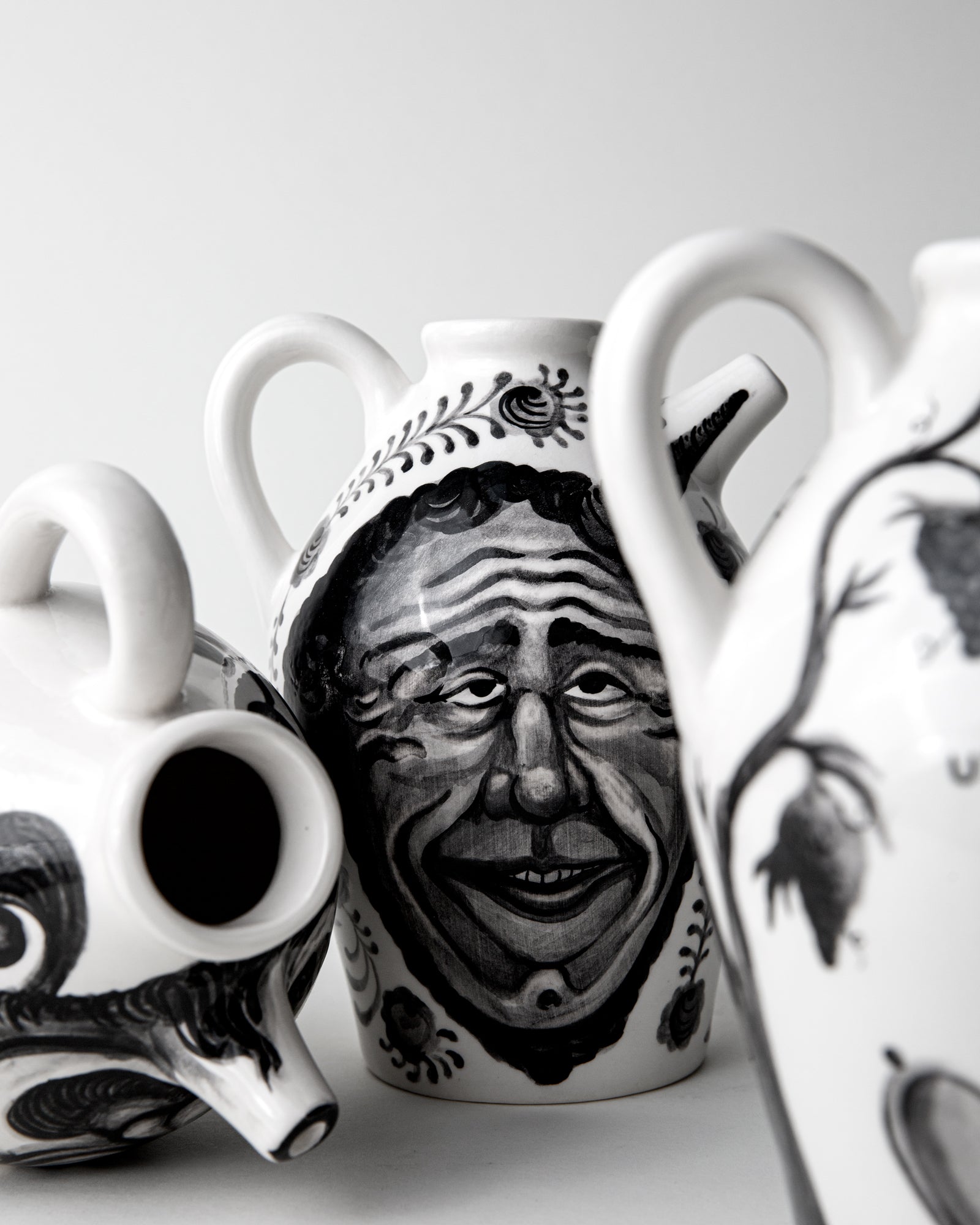 Base/34 designed a series of ceramic jugs that have been hand-painted by Ruco and inspired by illustrations and prints of Italian folk art declined through its characteristic masks.