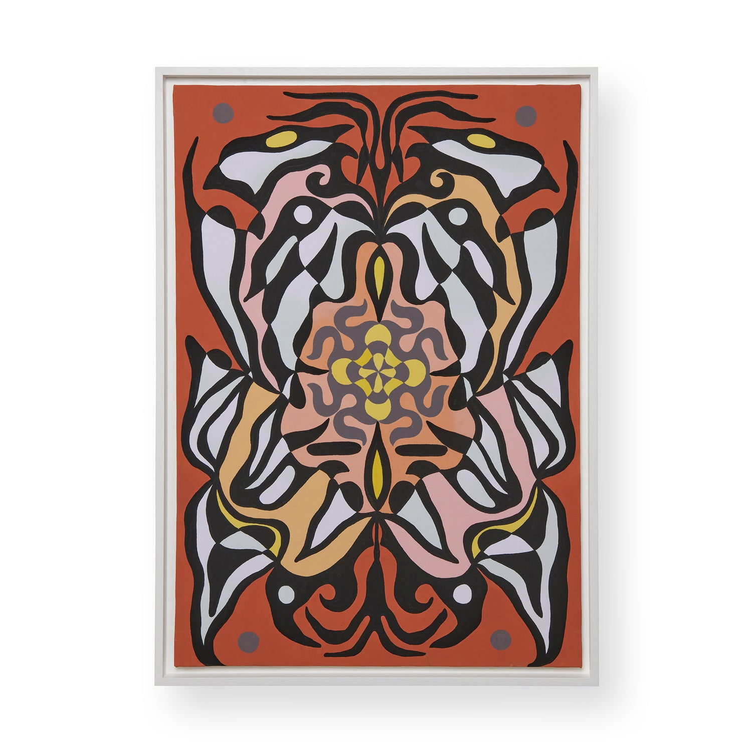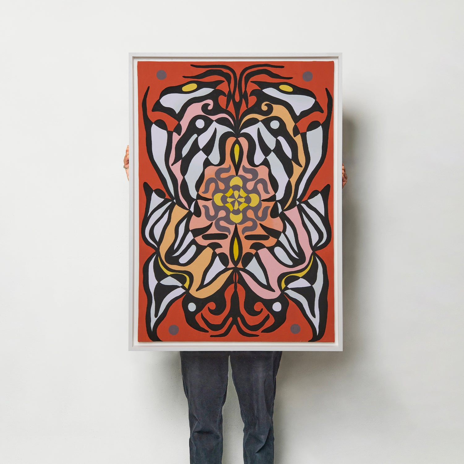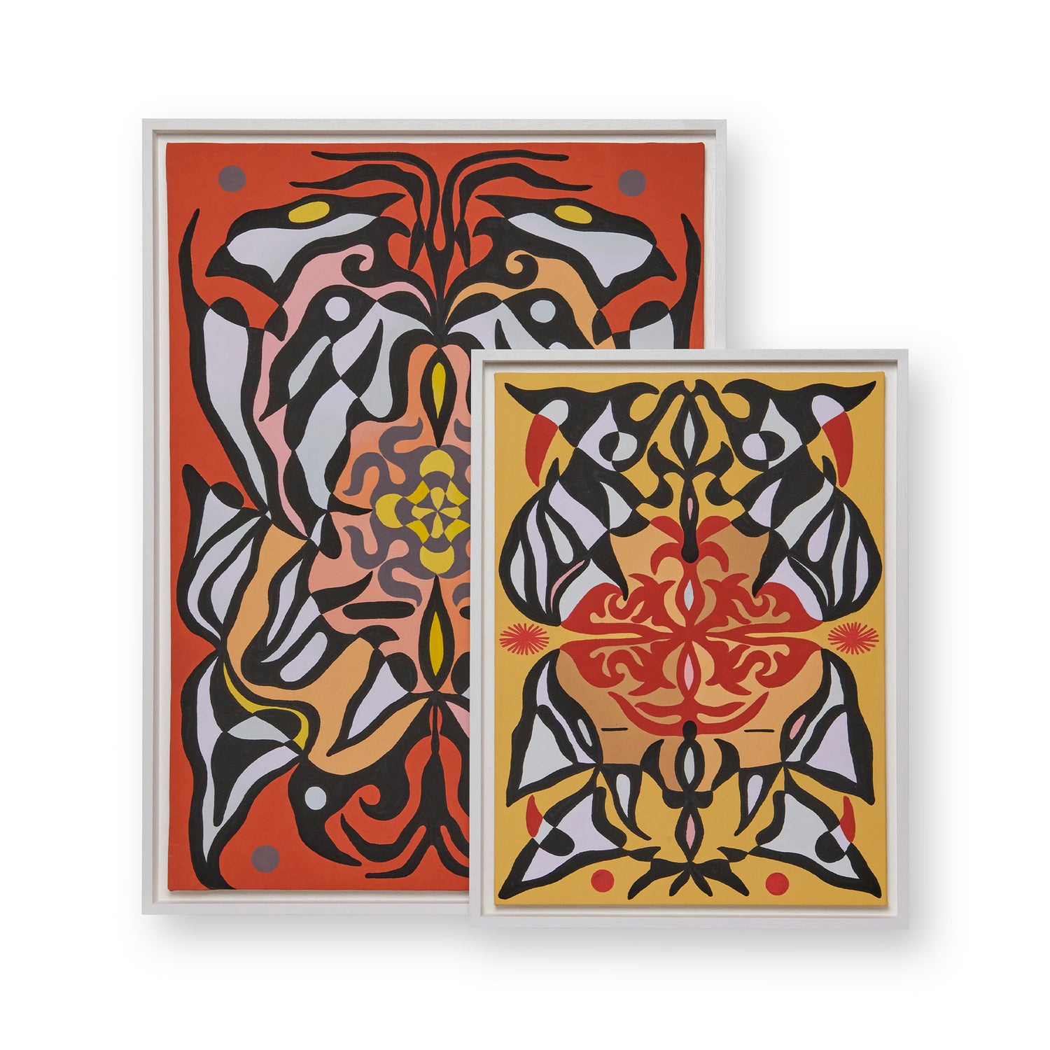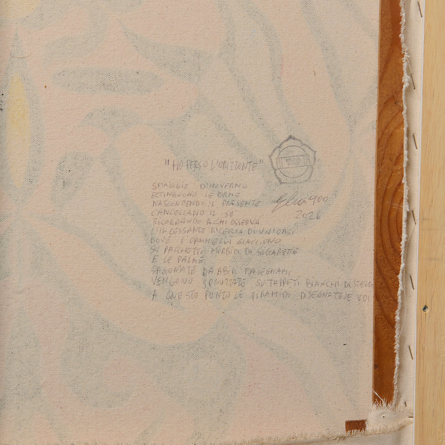Elia Novecento (Rome, 1989) is an Italian artist who lives and works in Rome. His involvement with the Roman underground street art movement started at a young age. He was quickly attracted to the world of graffiti letters and colors, and began to create them, focusing on composition and balance of geometries and colors. He graduated from the Ripetta Art School, where he learnt about the Roman School of Piazza del Popolo from painter/professor Cesare Tacchi, which brought him to pursue painting as his preferred medium. The Roman cultural atmosphere of the Sixties continues to be a rich source of inspiration and research for Elia's work. In 2016/2017 he founded Collettivo900 in Rome, together with artist Leonardo Crudi. In addition to creating wall paintings for public and private contracts, the two artists displayed hand-painted posters related to Italian cinema on city streets. The elements and symbols of the urban environment, Rome of the Sixties, together with literature, poetry and cinema, are the main suggestions that have given rise to multiple production cycles and constitute the reference system par excellence of his poetics. He is driven by the aim to create decodable and narrative visual structures in his work that, via a smart game of balances, bring the abstract world of geometric shapes into dialogue with the harmonious figurative world of human and animal profiles. Elia's signature can be seen in the use of the female form, which has no political implications. Although firmly linked to the world of mass media, from which it is extrapolated as a silhouette to be utilized for endless variables, he transforms it into a type of logo that mixes with the solidity of geometric shapes.Recently, he used carpets and fabrics from all over the world as a visual basis, which he frequently found in markets or private homes. Elia's urge to add his own word, his own trace, to objects that already have their personal history is expressed through his visual engagement with them. An artistic action that is never impulsive, but always meditated, that presents itself as a precise "textile work" by inserting and continuing the previously stitched shapes and narrative without interruption. This interest also exists in a specific geometric context related to the concept of texture: a collection of shapes that form a perfect pattern. The artist sees this pattern as a flawless algorithm that must be penetrated in order to combine with one's own image, allowing order and chaos, objectivity and subjectivity to coexist.