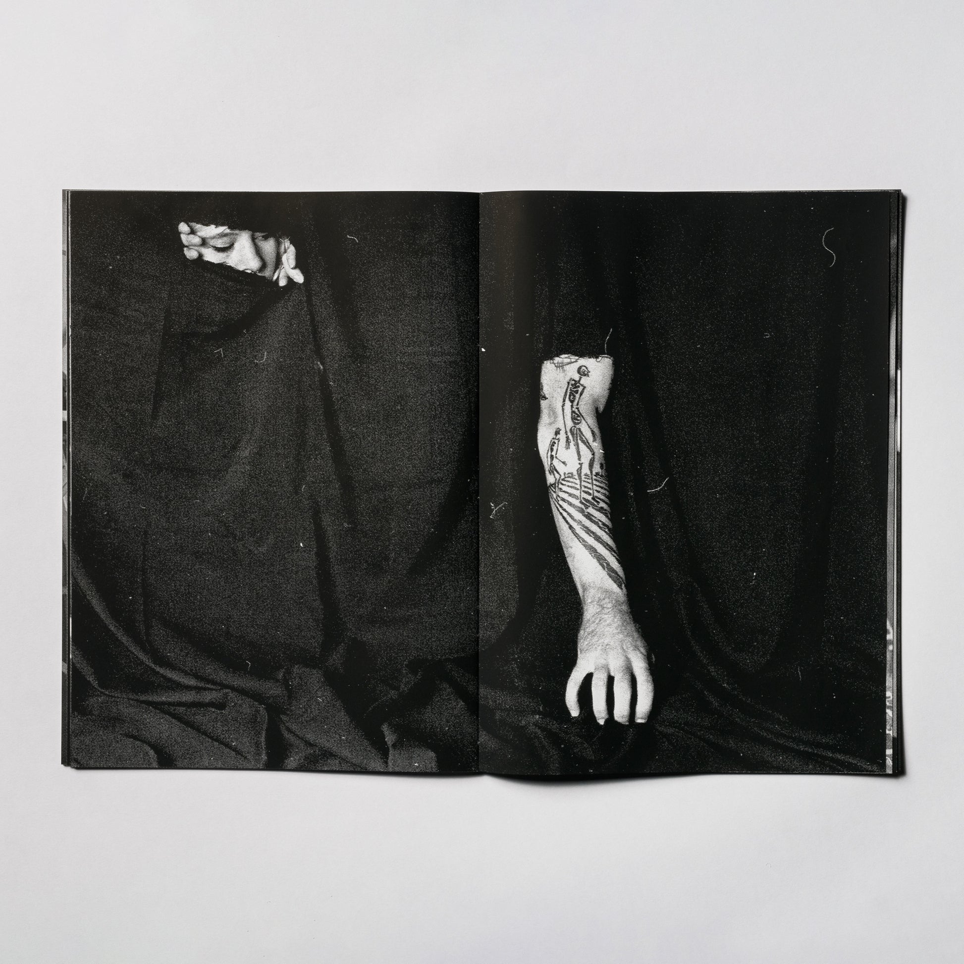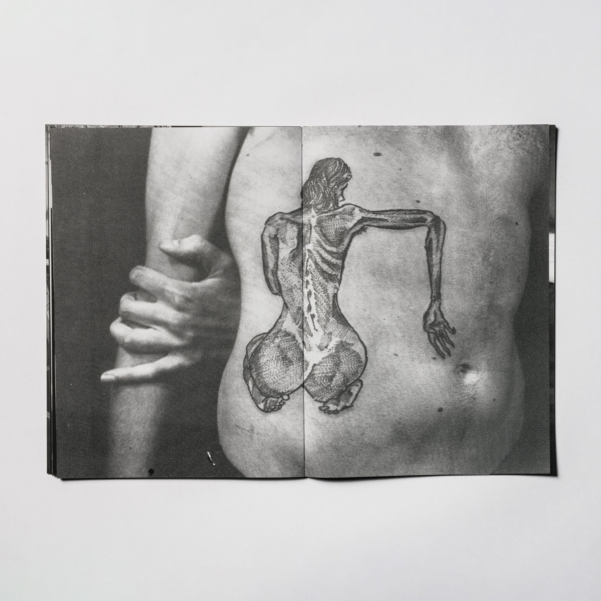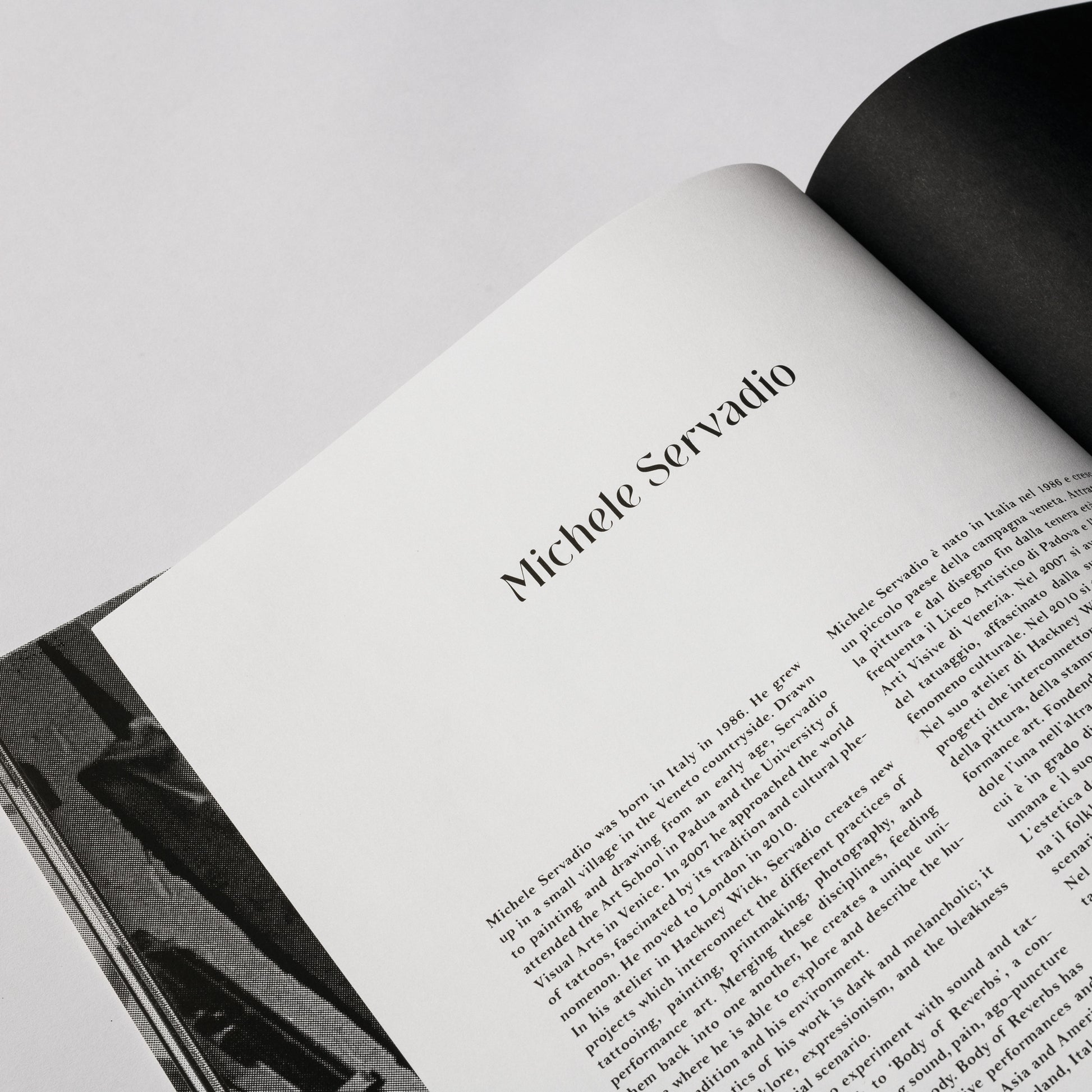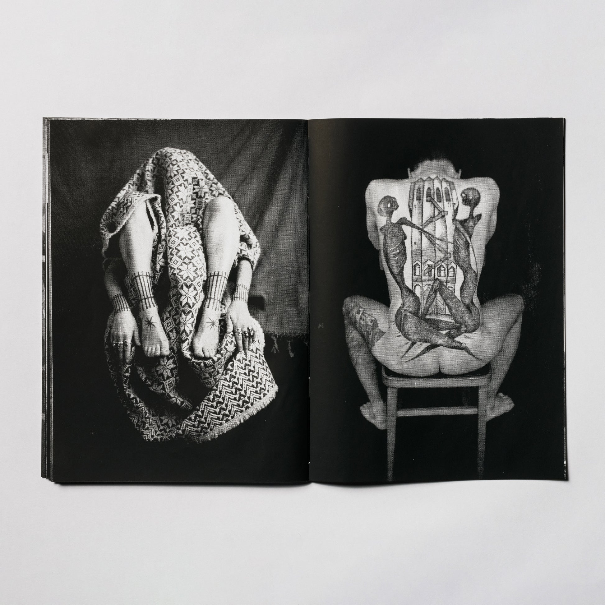 “This book is a collection of photographs I have taken in my studio in London. It is the place where I paint and print. A temple of creation and intimate space. I felt the need to highlight the connection between the people I tattoo and the place where I create.It is an effort to transcend tattooing by celebrating the tenderness of a body that has just changed. I use photography by need. Tattoos are ephemeral; they demand to be documented. Tattooing is not just adding ink under the skin: it changes a human being and therefore modifies the environment around it. By portraying people in my studio, in front of my paintings, and making them interact with sculptures and objects, I try to comprise the practice of tattooing into the bigger picture of art creation. By stepping back with the camera, the studio becomes the stage where these people exist. I can see relationships between them and the environment. Artworks become props for portraits and people become the life characters of my paintings.I can keep track of a tattoo within the context of the body where it lives and of the environment where the person exists. Everything merges.”Servadio