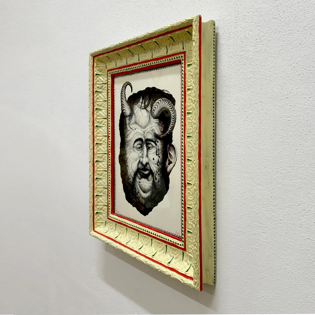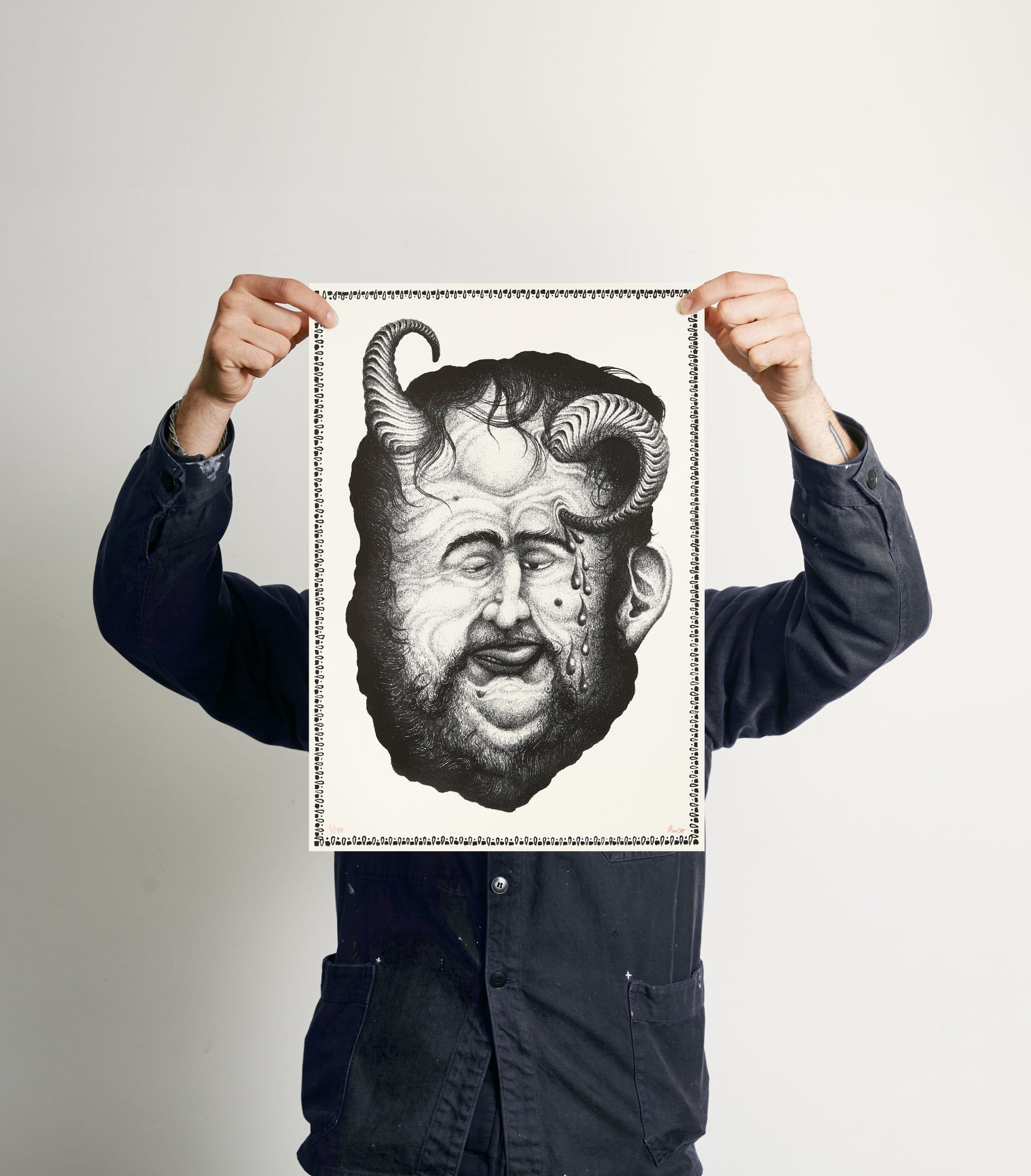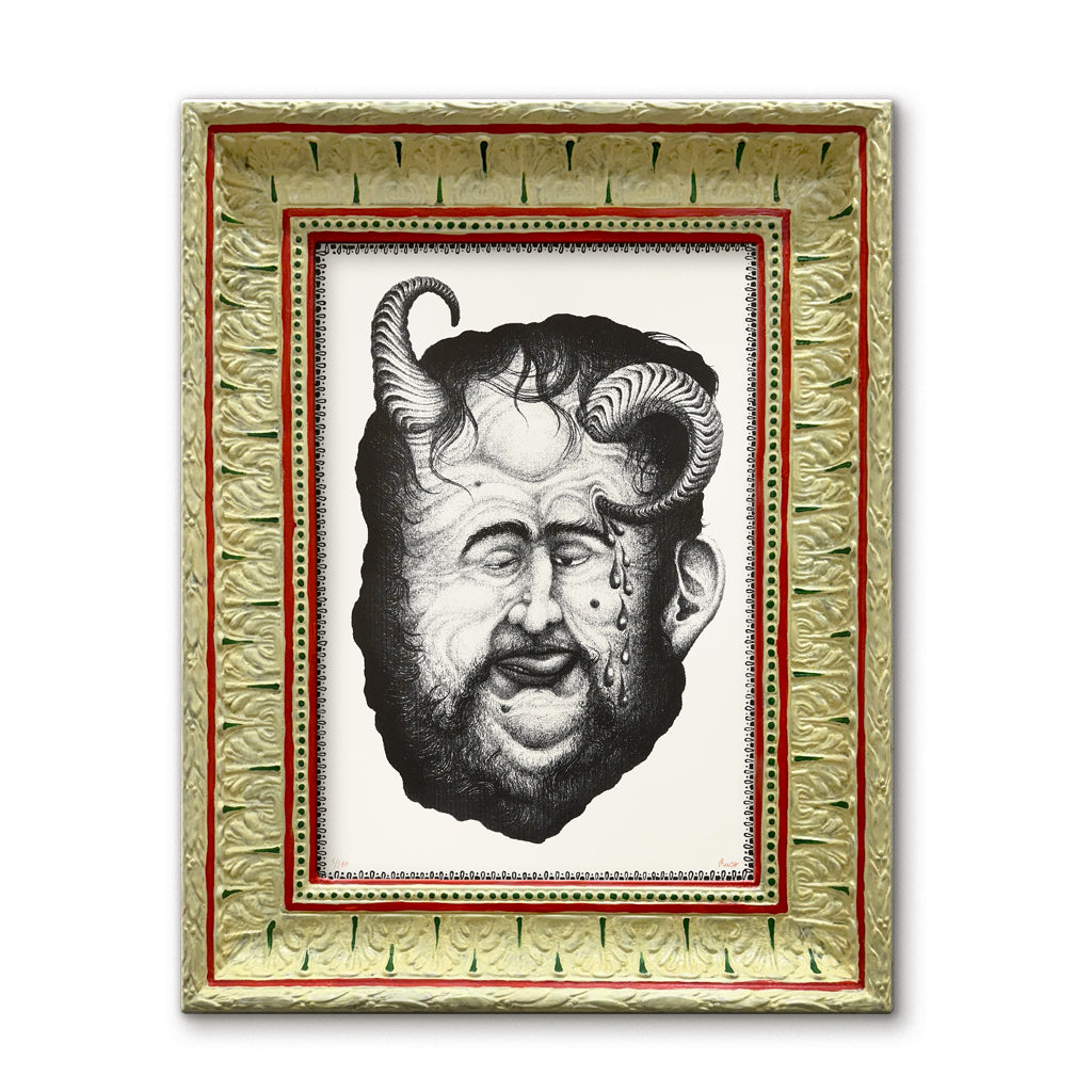 “Through an apotropaic mask, the artist depicts the gradual deterioration of his own body and psyche due to its shortcomings.