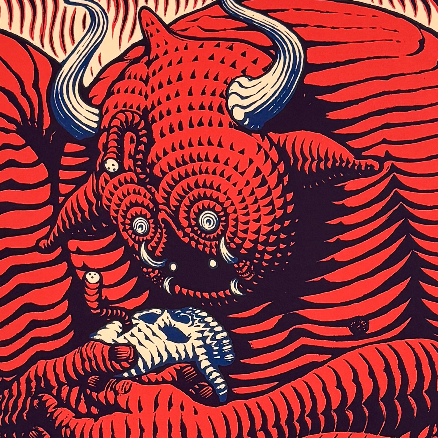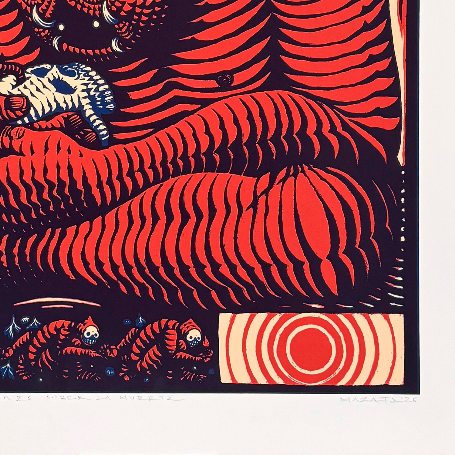 Mazatl is a contemporary artist whose relief prints, drawings, paintings, murals, and installations explore themes of unity, nature, introspection, healing, and liberation. He currently resides in Chiapas, Mexico.