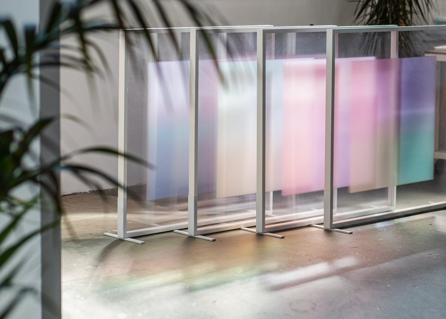 Each artwork of “Miacromia” series is composed of four sheets of plexiglass, which, as in the case of the artbook, have been screen-printed with gradients of color of increasing intensity. Held together by the white frame, the overlapping sheets create four-colors that suggest to our sight the union given by the sum of the individual parts. The artist gives the observer the task of analytically breaking down the first visual impact and separating it into its original shades, thus making it necessary to make an effort to analyze the color as a pure element, extrapolated from the context within which we are used to reading and perceiving it.