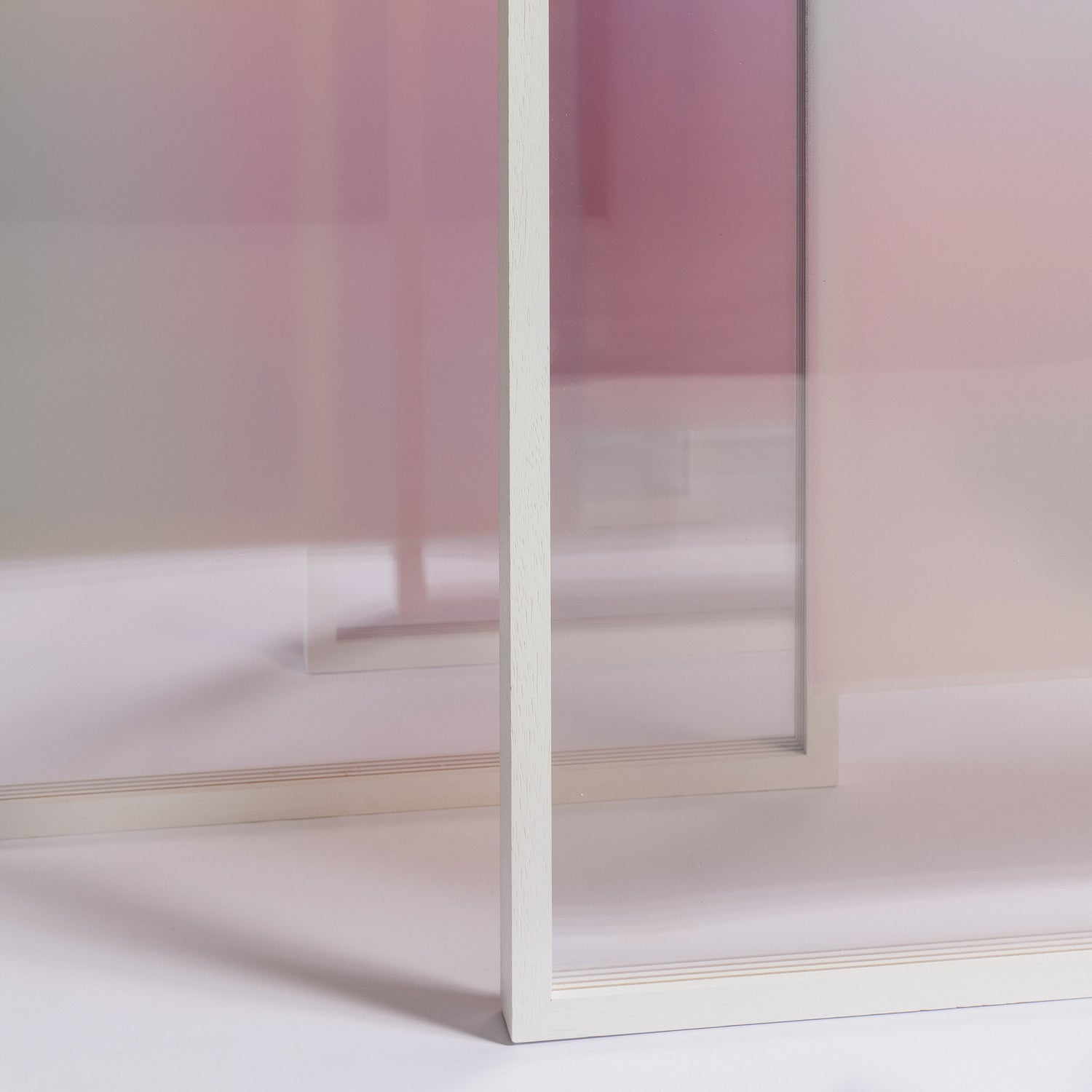 “The intent of these works is to create invisibility, a cloud given by the mellow and soft color, the four layers give depth to the cloud and the transparent margin gives it structure, the central element is the white frame that detaches the object from its context.”