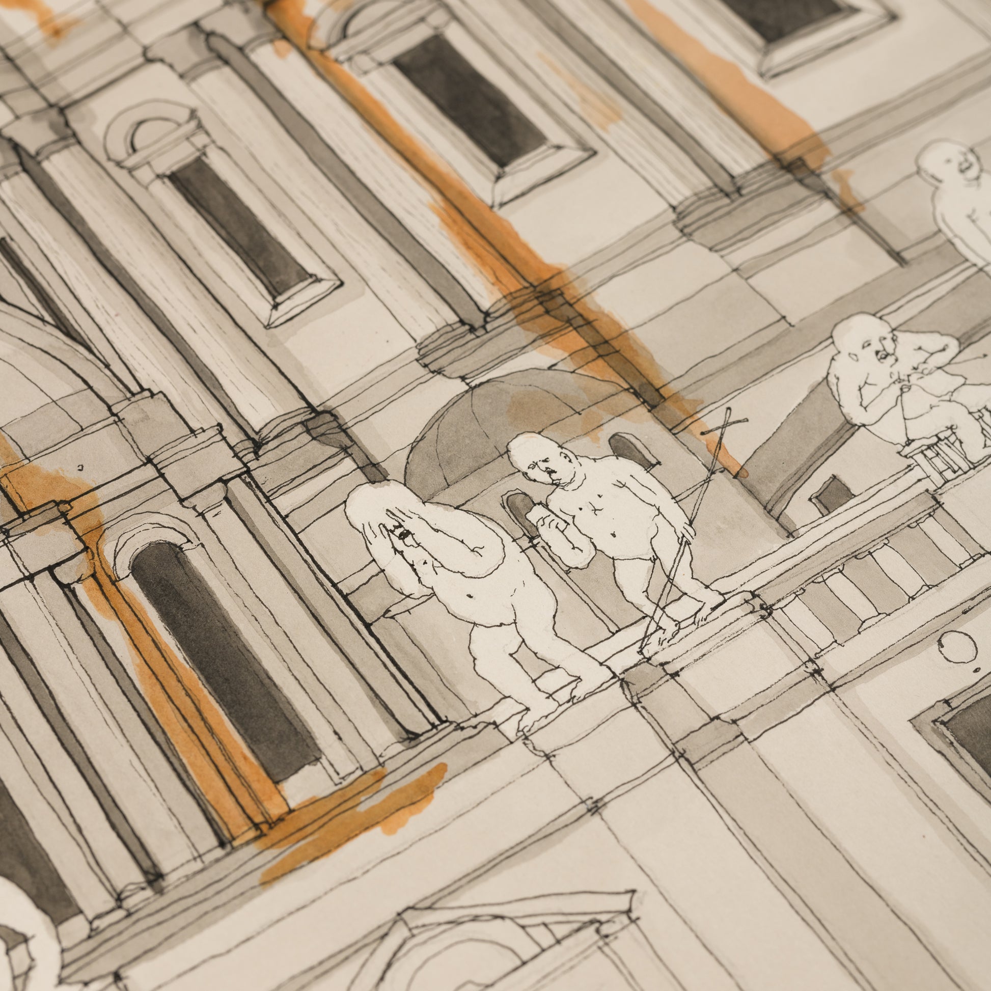 Nemo’s began drawing as a child, later on recognizing this gesture as the most authentic way of expressing himself. In 2002 he started painting walls in abandoned spaces or factories; he then adopted the name of the main character of the book “Little Nemo in Slumberland” by cartoonist Winsor McCay. His first inspiration came from anatomy, biology and the comics books he found at home, together with science fiction movies and dystopian cyberpunk tales of the early 1980s. Since the very beginning he was interested in human beings as “social animals”, which led him to define a prototype of a hominid describing the contradictions of our time: “Naked and devoid of any sign of civilization, the human being shows itself for what it really is: a defenseless creature at the mercy of nature and of itself without hierarchical structures, whose only purpose is to survive”. In a balance between wonder and repulsion, Nemo’s thus describes contemporary society and tries to give a name to what surrounds him.