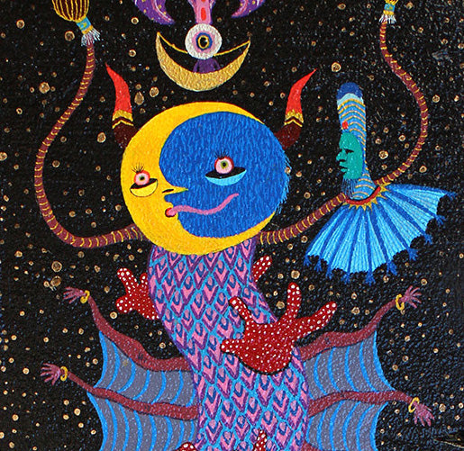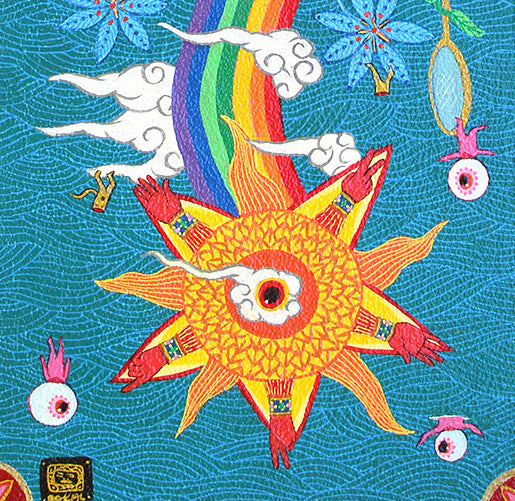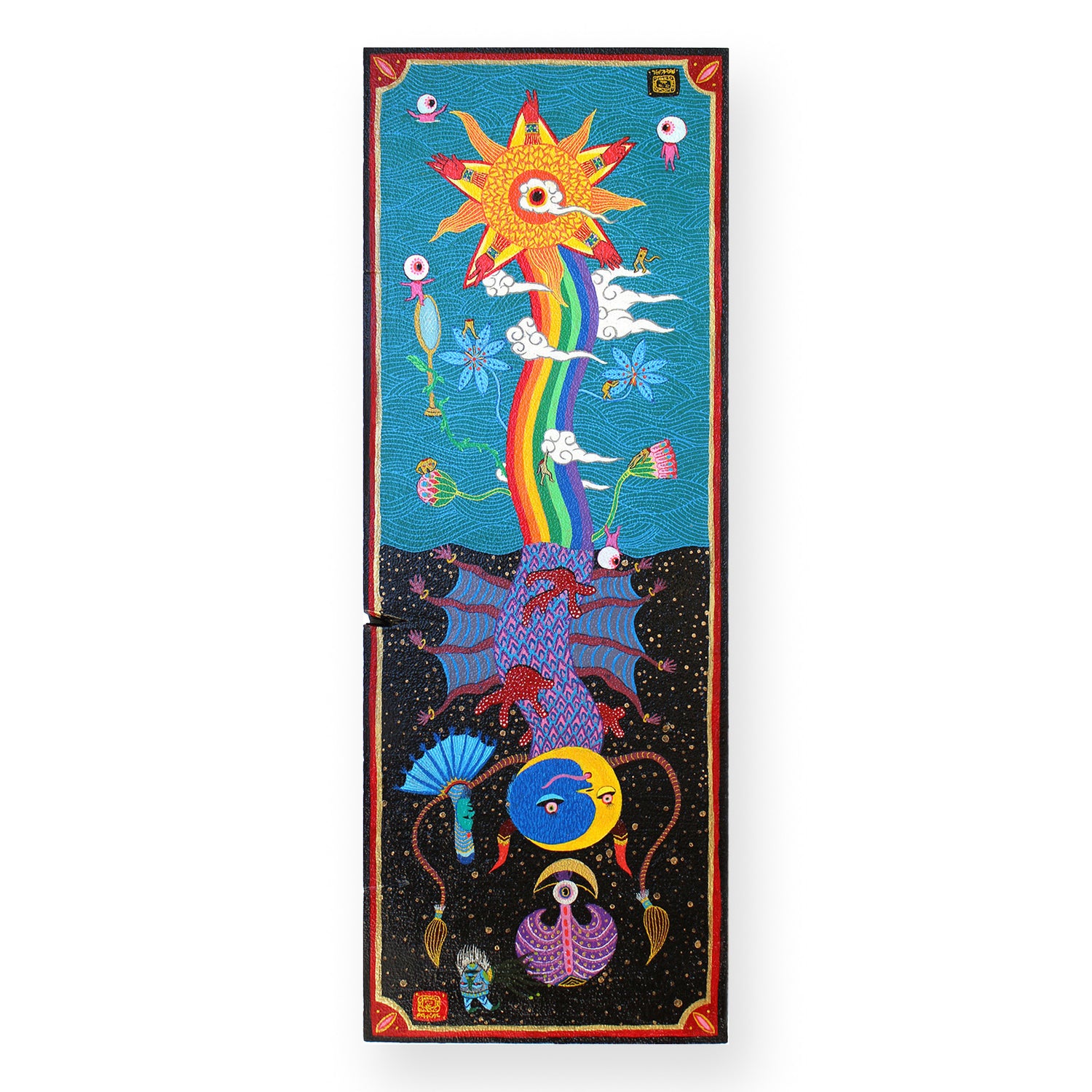 Pakal’s uses of vivid colours and mixed media along with the mysterious background and connection with the Far East and Indigenous art of Central American add to the intrigue in the artwork.
