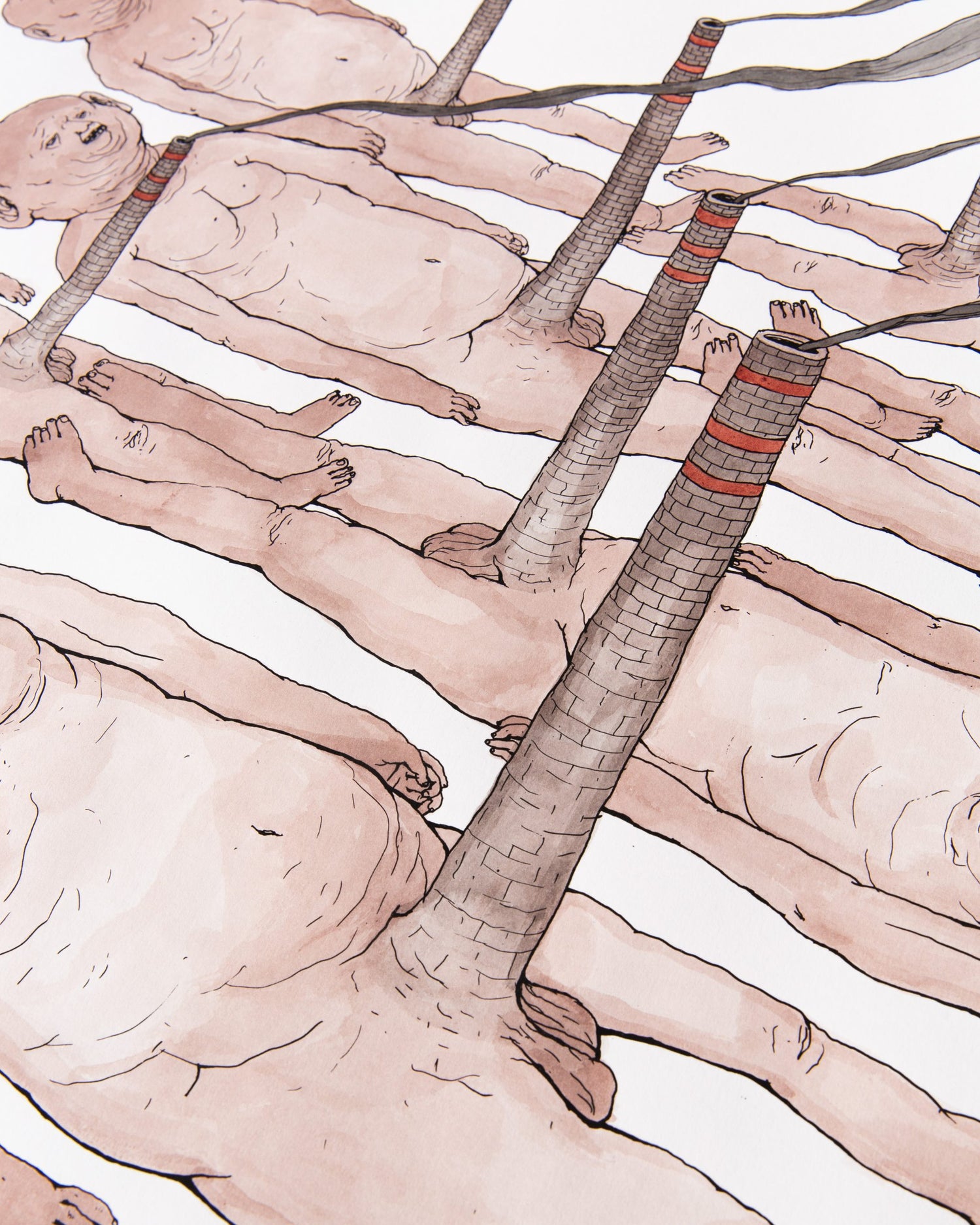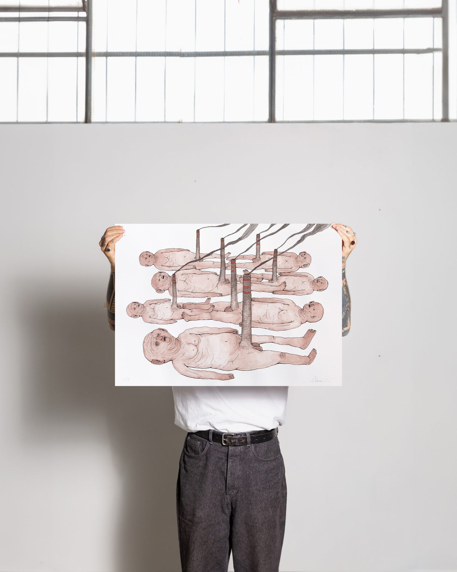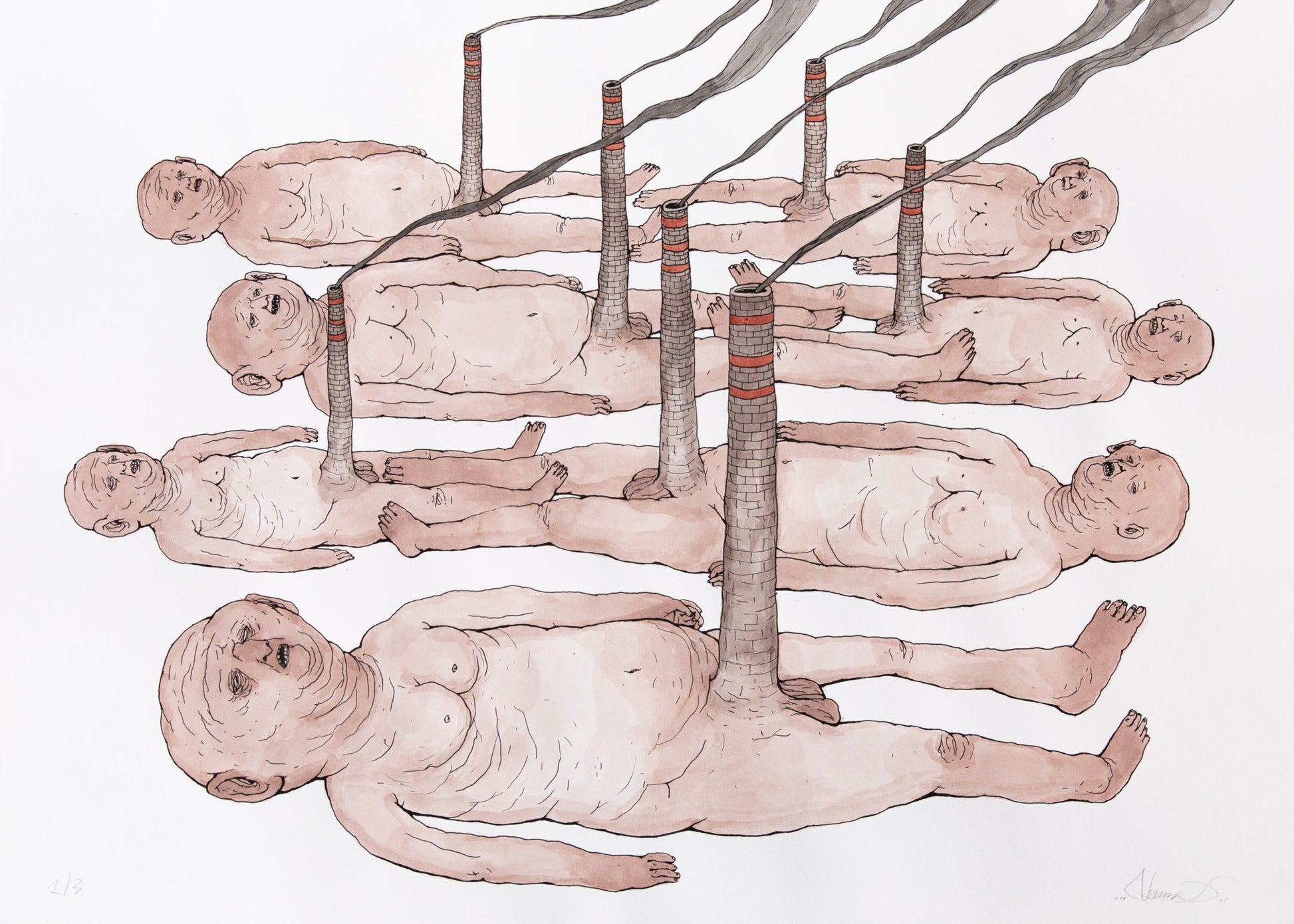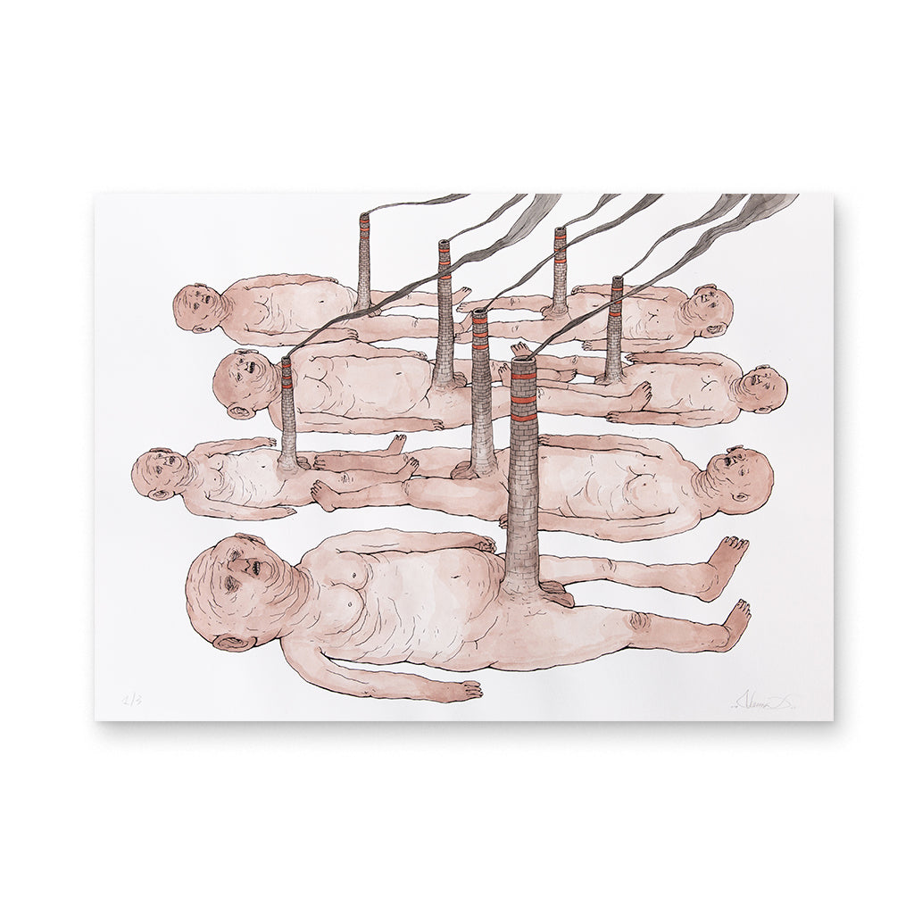 Nemo’s began drawing as a child, later on recognizing this gesture as the most authentic way of expressing himself. In 2002 he started painting walls in abandoned spaces or factories; he then adopted the name of the main character of the book “Little Nemo in Slumberland” by cartoonist Winsor McCay. His first inspiration came from anatomy, biology and the comics books he found at home, together with science fiction movies and dystopian cyberpunk tales of the early 1980s. Since the very beginning he was interested in human beings as “social animals”, which led him to define a prototype of a hominid describing the contradictions of our time: “Naked and devoid of any sign of civilization, the human being shows itself for what it really is: a defenseless creature at the mercy of nature and of itself without hierarchical structures, whose only purpose is to survive”. In a balance between wonder and repulsion, Nemo’s thus describes contemporary society and tries to give a name to what surrounds him.