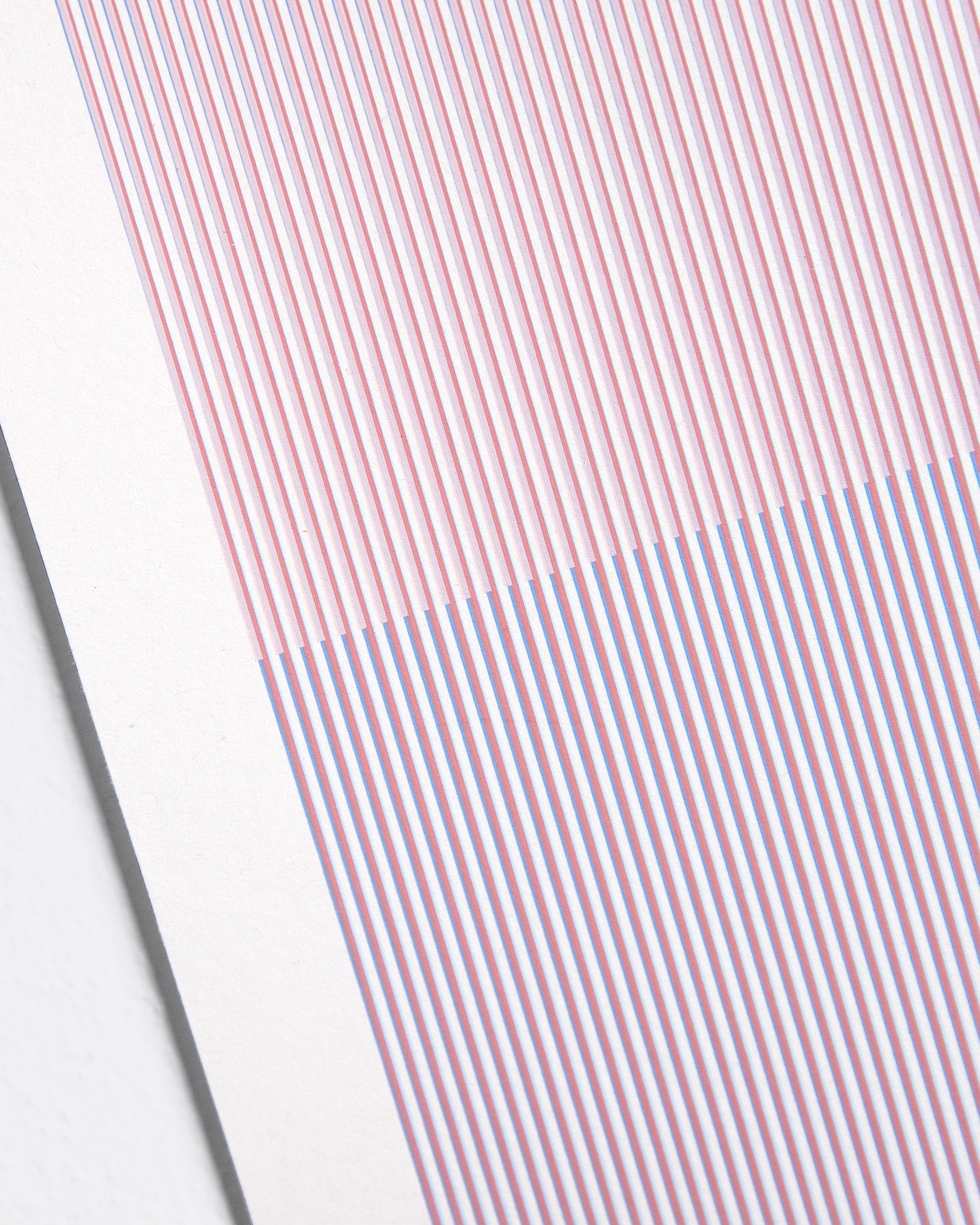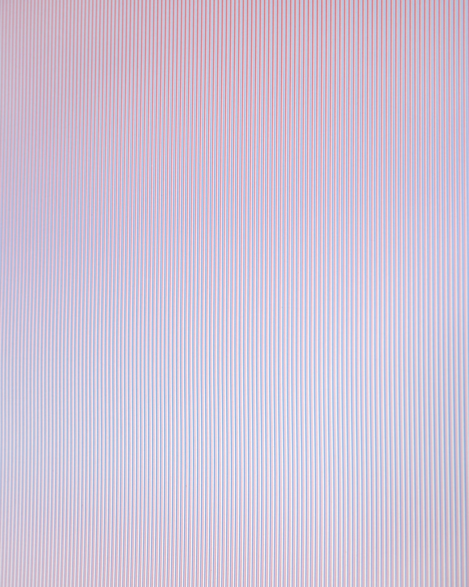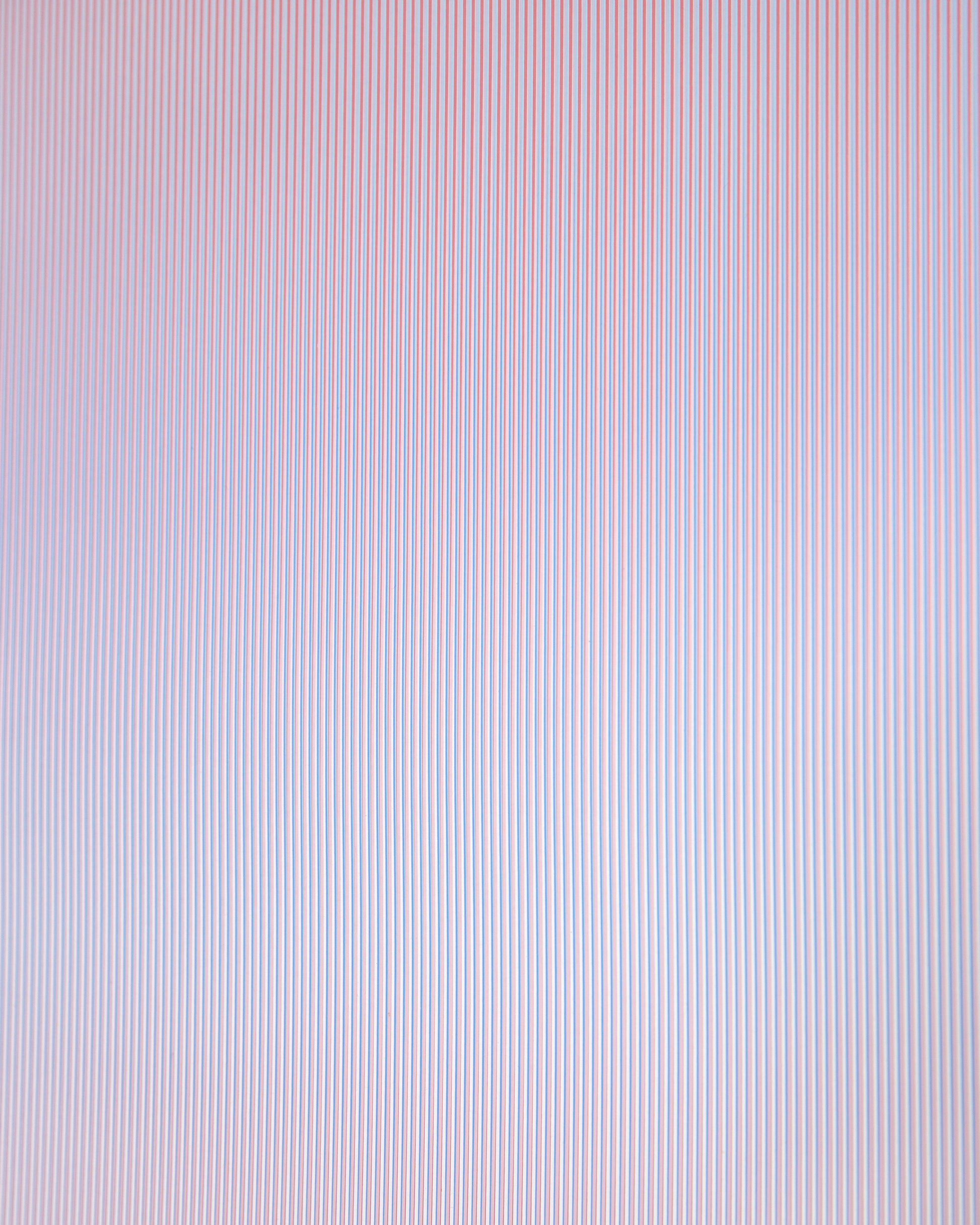 Hence, two projects are born. The first one follows the experience of the series “Mathematical View”; it was born as an extension of the reflection about the complex relationship that exists between human beings and the rules of nature, whose language is encoded by geometry. The artist’s goal is to achieve a pictorial result, thus influenced by human instinct and its randomness, using the strict rules of geometry. Then, composing lines of colors overlap and blend with each other, creating color shades that elicit a feeling of visual completeness like that from the light that becomes dim at dawn and dusk.