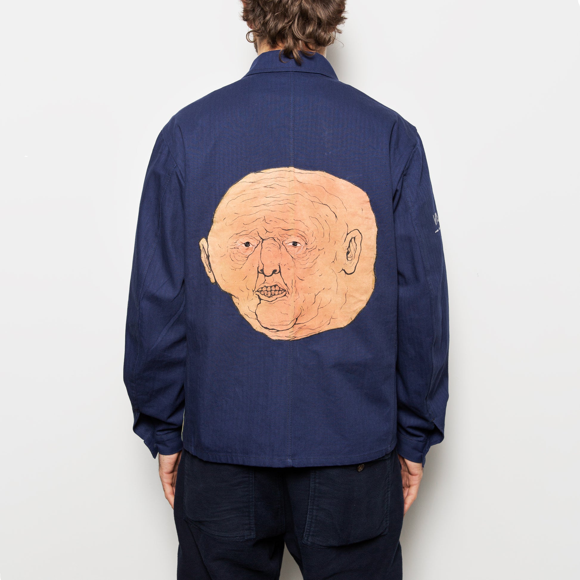The medium for the entire collection consists of vintage jackets used by French railroad workers. It is a blue jacket with a button closure to which three pockets are applied.