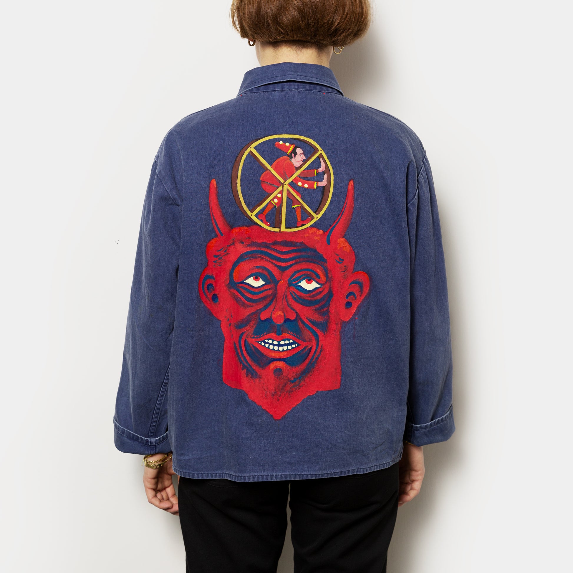 The medium for the entire collection consists of vintage jackets used by French railroad workers. It is a blue jacket with a button closure to which three pockets are applied.